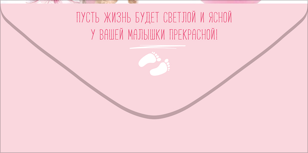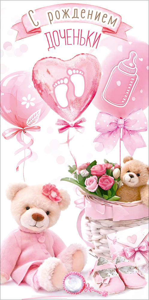 Конверт для денег "С рождением доченьки" (мишка в пижамке, мишка в корзине с розами, воздушные шарики, туфельки, погремушка, конвертик)