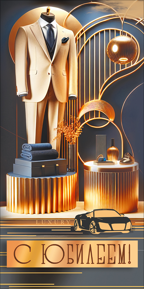 Конверт для денег "С Юбилеем!" (костюм на манекене в витрине, машина)