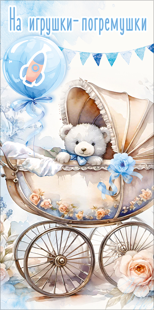 Конверт для денег "На игрушки-погремушки" (коляска с медвежонком, синий шарик с ракетой, розы)