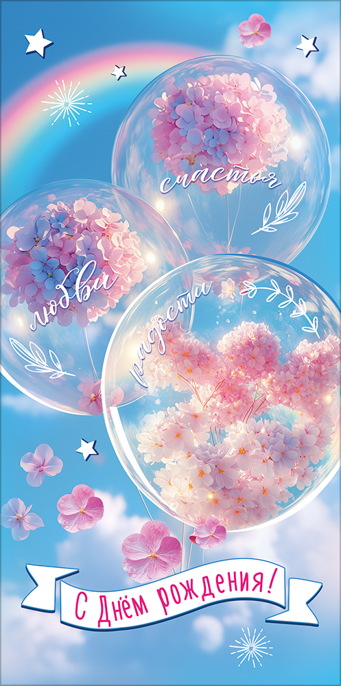 Конверт для денег "С Днём рождения! Счастья, любви, радости" (цветы внутри прозрачных шаров, радуга)