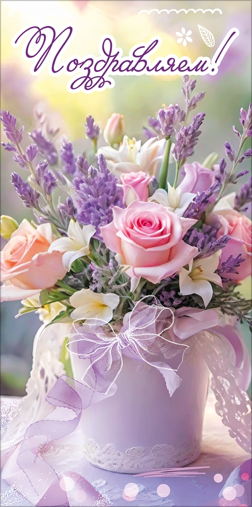 Конверт для денег "Поздравляем!" (букет из разных цветов в белом ведёрке)
