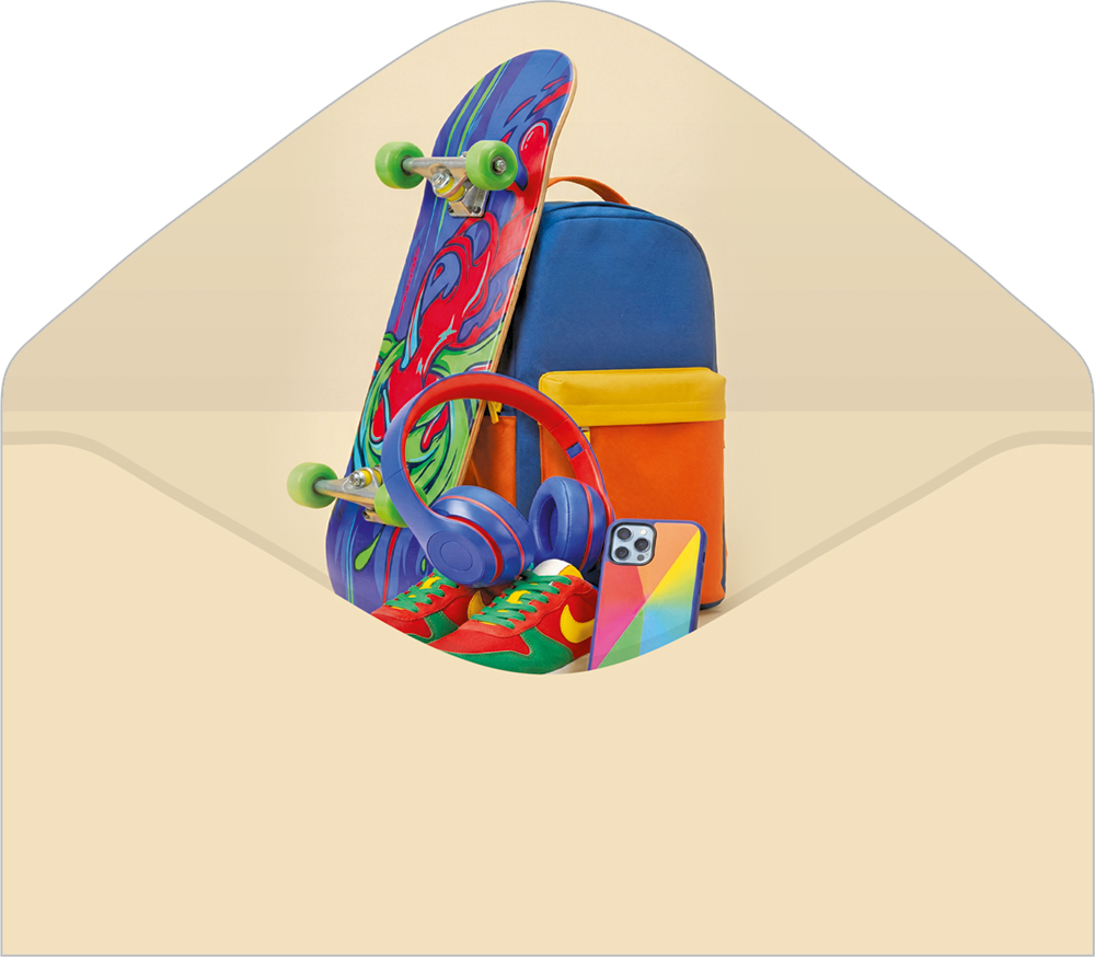 Конверт для денег "С Днём рождения!" (скейтборд, рюкзак, наушники, кроссовки, смарфон)