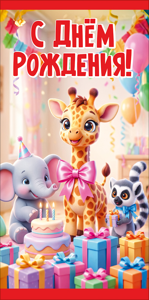 Конверт для денег "С Днём рождения!" (жирафик, слонёнок и лемур с тортом и подарками)