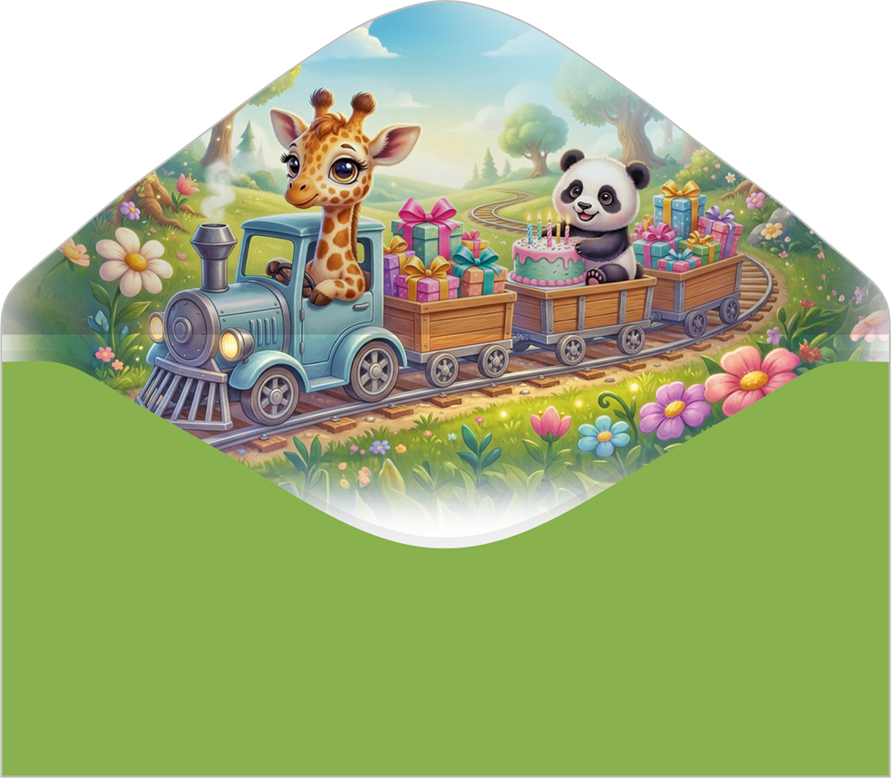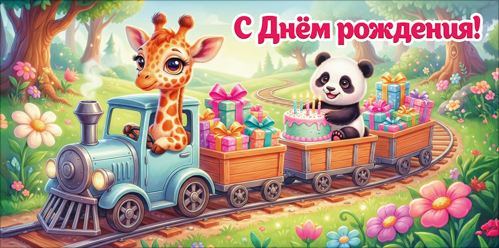 Конверт для денег "С Днём рождения!" (жирафик и панда на паровозике с тортом и подарками)