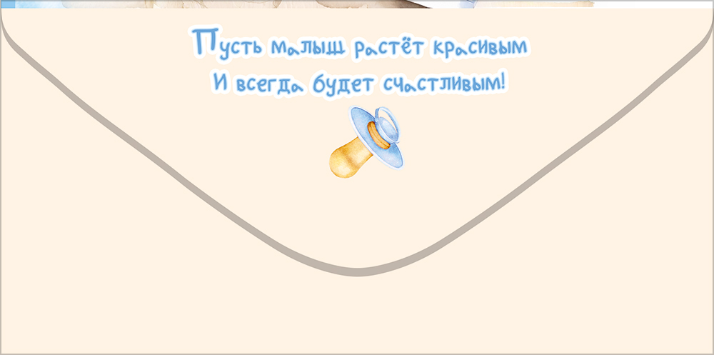Стильный конверт для денег с надписью «На пеленки-распашонки. Крохе» идеально подходит в качестве подарка или дополнения к подарку. Конверт украшен яркой иллюстрацией. Четкое полноцветное изображение декорировано сияющими голографическими блестками в лаке, что привлечет внимание и взрослых, и детей. На конверте изображены боди с медвежонком для мальчика, голубые пинетки и букетик цветов. На внутреннем клапане написано небольшое пожелание. Размеры – 168х84 мм. На нашем сайте можно заказать конверты для денег оптом. В одной упаковке 10 шт.