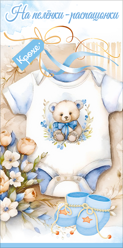 Конверт для денег "На пелёнки-распашонки. Крохе" (боди с мишкой для мальчика, пинетки, букетик, бирка с лентами)