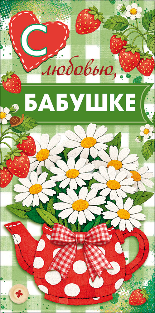 Поздравительный конверт для денег «Бабушке с любовью» с жизнерадостным дизайном преобразит любое торжество. Композиция с ромашками, клубникой и декоративным чайником вызывает теплые, домашние ассоциации. Светлая палитра и текстильные элементы создают атмосферу заботы и искренности. Конверт выглядит живым, душевным и по-особенному уютным. Дополнительное изящество придают фисташковые блестки в лаке — они аккуратно переливаются и надежно закреплены, не теряя своего вида со временем. Также внутри находится текст с приятными пожеланиями. Данный дизайнерский конверт для денег идеально подойдет в качестве основного подарка или как приятное дополнение к нему. Внутрь можно поместить любую денежную сумму, подарочный сертификат или билеты на концерт. Благодаря прочным материалам производства и качеству печати изделие удобно транспортировать и хранить – оно надолго сохранит свой яркий внешний вид, не помнется и не выцветет, что делает его не только хорошим подарком, но и прекрасным памятным сувениром!