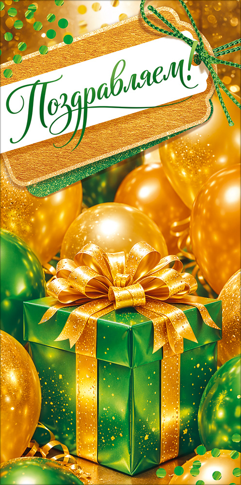 Поздравительный конверт для денег «Поздравляем!» преобразит любое торжество. Яркий праздничный дизайн с подарком и шарами создает ощущение радости и торжества с первого взгляда. Насыщенные зеленые и золотые оттенки придают оформлению глубину и эффектность. Конверт выглядит нарядным и выразительным, идеально подходя для особого случая. Фисташковые блестки, закрепленные в лаке, усиливают блеск и надежно защищены от осыпания. Также внутри находится текст с приятными пожеланиями. Данный дизайнерский конверт для денег идеально подойдет в качестве основного подарка или как приятное дополнение к нему. Внутрь можно поместить любую денежную сумму, подарочный сертификат или билеты на концерт. Благодаря прочным материалам производства и качеству печати изделие удобно транспортировать и хранить – оно надолго сохранит свой яркий внешний вид, не помнется и не выцветет, что делает его не только хорошим подарком, но и прекрасным памятным сувениром!