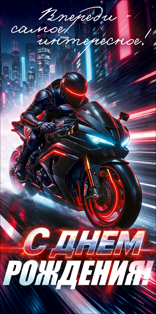 Поздравительный конверт для денег «С Днем Рождения!» преобразит любое торжество! Изделие выполнено в динамичном, футуристическом дизайне: скоростной мотоцикл, интересные световые акценты в красных и голубых оттенках гармонично сочетаются с видом ночного города и небоскребов. Такое оформление точно придется по вкусу целеустремленным и современным мужчинам. Также внутри находится текст с приятными пожеланиями. Данный дизайнерский конверт для денег идеально подойдет в качестве основного подарка или как приятное дополнение к нему. Внутрь можно поместить любую денежную сумму, подарочный сертификат или билеты на концерт. Благодаря прочным материалам производства и качеству печати изделие удобно транспортировать и хранить – оно надолго сохранит свой яркий внешний вид, не помнется и не выцветет, что делает его не только хорошим подарком, но и прекрасным памятным сувениром!