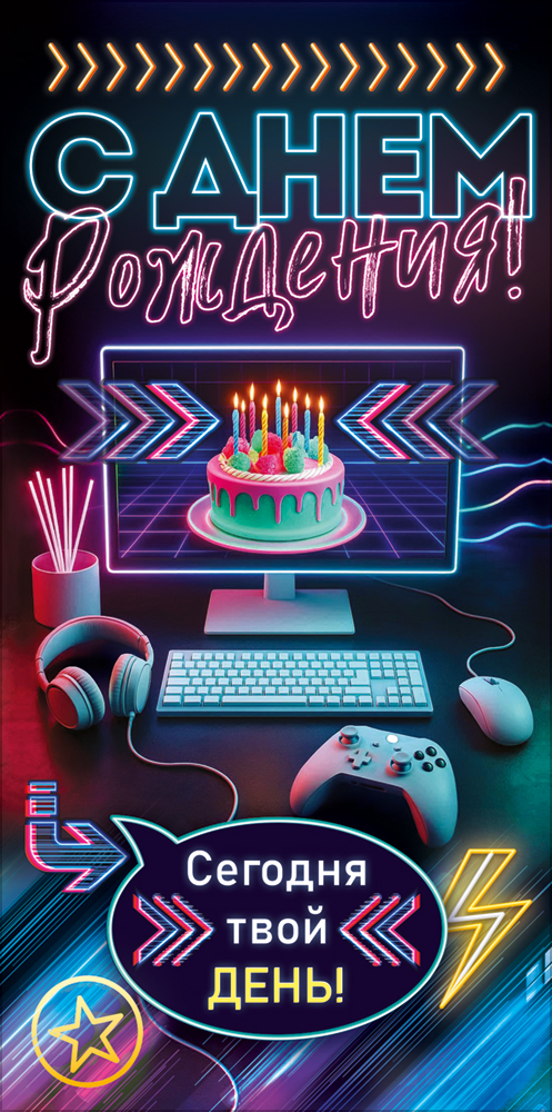 Конверт для денег "С Днем Рождения!" (неоновые надписи, компьютер с тортом на экране)