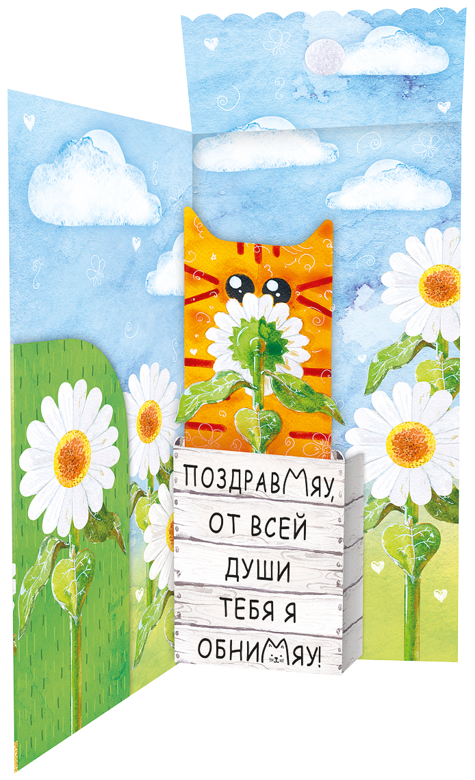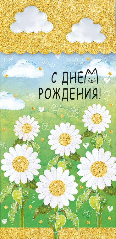 Конверт для денег формата А4 предназначен для упаковки и вручения денежных подарков на день рождения. Изделие выполнено из плотного картона, что обеспечивает стабильную геометрию и устойчивость к деформации при хранении и транспортировке, удобно для оптовых поставок и выкладки на стеллажах. Размер готового изделия 252 × 132 мм позволяет свободно разместить купюры стандартных размеров без сгибов, а также вложить поздравительную записку или небольшую плоскую открытку. Конструкция 3D формирует объёмный эффект на лицевой стороне: декоративные элементы с ромашками и облаками визуально приподняты над фоном, за счёт чего конверт хорошо выделяется в ассортименте и подходит для формирования тематических витрин. Лицевая сторона оформлена цветной печатью с надписью «С днём рождения!» и яркой композицией из ромашек на зелёном фоне, верхняя и нижняя части дополнены золотистыми зонами, имитирующими рассыпанный блеск. В отделке применены радужные блестки в лаке, создающие мерцающий эффект при искусственном и дневном освещении; покрытие устойчиво к осыпанию при стандартной эксплуатации, что важно при многократных перекладках в оптовых партиях. Внутренняя сторона предусматривает текстовое поздравление, что сокращает время подготовки подарка для розничного покупателя и делает изделие самодостаточным без дополнительной открытки. Конверт рассчитан на единичное вручение, в упаковке 1 штука, что удобно как для розничной продажи поштучно, так и для формирования смешанных оптовых заказов по различным дизайнам в рамках одной категории товара.