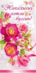 Свадебный конверт для денег на татарском языке. Конверт поможет красиво оформить денежный презент для молодоженов. Такая упаковка сохранит интригу и создаст эффект сюрприза. Очаровательный рисунок с цветочной композицией покрыт глянцевым УФ-лаком. Такое покрытие защищает изображение от выцветания и повреждений, а также придает ему стильный блеск. Оригинальный дизайн дополнен поздравительной надписью на татарском.