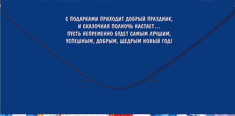 Конверт для денег формата «Евро» предназначен для оформления подарка к новогодним и зимним праздникам и ориентирован на массовое использование в розничных сетях, сувенирных отделах и корпоративных закупках. Изделие изготовлено из плотного картона, что обеспечивает стабильную геометрию при хранении и транспортировке, устойчивость к сгибам и истиранию, а также аккуратный внешний вид на полке и в процессе передачи подарка. Размер готового конверта 168 × 84 мм позволяет удобно размещать стандартные денежные купюры и подарочные сертификаты без сгибания, что снижает риск деформации вложения и упрощает работу кассиров, продавцов и кладовщиков при формировании наборов. Лицевая сторона оформлена полноцветным изображением Деда Мороза и Снегурочки на зимнем фоне с надписью «Подарок от Деда Мороза и Снегурочки», что делает конверт тематически понятным для конечного покупателя и позволяет использовать его как самостоятельный элемент подарочного оформления без дополнительной упаковки. Применена серебряная фольга, создающая локальные акценты и повышающая износостойкость отдельных декоративных элементов за счет дополнительного защитного слоя; такое решение визуально выделяет конверт в выкладке и облегчает подбор ассортимента по праздничной группе товаров. Внутреннее текстовое оформление поддерживает новогоднюю тематику и упрощает выбор для розничного клиента, который получает готовое решение без необходимости подписывать конверт вручную. Конверты поставляются по 10, что удобно для оптовых покупателей при планировании закупок, формирования фасовок и учета остатков: кратность партии оптимальна для выкладки на прикассовых зонах, сезонных стендах и при подготовке корпоративных подарочных наборов. Плоская форма и стандартный формат обеспечивают рациональное использование складского пространства, возможность штабелирования без деформации и совместимость с типовыми коробами и транспортной упаковкой, что снижает риски повреждений при перевозке и упрощает логистику в сезон повышенного спроса.