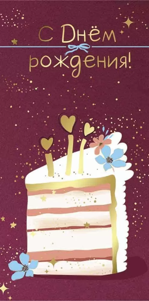 Поздравительный конверт для денег «С Днем рождения!» с ярким оформлением, изображением кусочка торта с 3 свечками и отделкой из золотой фольги! Милый дизайн и приятные пожелания в виде стихотворения точно порадуют именинницу!