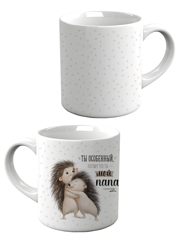 Кружка керамическая объёмом 330 мл предназначена для повседневного использования в домашних условиях, офисе и в сегменте подарочной продукции. Изделие выполнено из плотной керамики с равномерными стенками, что обеспечивает стабильную форму, устойчивость к растрескиванию при стандартной эксплуатации и сохранение температуры напитка в течение достаточного времени. Габариты готового изделия около 120 × 80 мм позволяют удобно размещать кружку на большинстве офисных столов, подставок и полок, а также оптимизируют выкладку на витрине и хранение на складе. Внешняя поверхность белого цвета с мелким повторяющимся узором и иллюстрацией двух ёжиков дополнена надписью «Ты особенный, потому что ты мой папа», за счёт чего изделие может использоваться как готовое решение для ассортимента подарков ко Дню отца, дню рождения и семейным датам. Ровный край и стандартная цилиндрическая форма удобны для питья и подходят под большинство бытовых сушилок и посудных шкафов, ручка рассчитана на комфортный хват одной рукой. Керамика совместима с распространёнными горячими и холодными напитками: чаем, кофе, какао, соками, водой. Поверхность кружки устойчива к многократному мытью при аккуратном обращении, что важно для объектов розничной торговли, кафе с сувенирной продукцией и корпоративных закупок. Нейтральная цветовая гамма и тематический сюжет делают изделие универсальным элементом линейки подарочных кружек семейной тематики, удобным для формирования серийных коллекций и стандартных упаковочных решений. Количество в упаковке: 1.