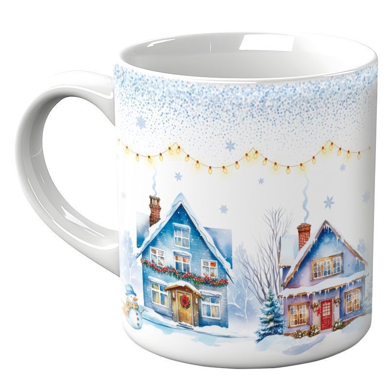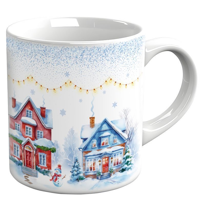 Кружка керамическая объёмом 330 мл предназначена для регулярного использования в бытовом и профессиональном сегменте. Корпус выполнен из керамики с ровными стенками и устойчивым дном, что обеспечивает надёжное размещение на столе и минимизирует риск опрокидывания при эксплуатации в офисах, кафе, гостиницах и других объектах с высокой проходимостью. Длина изделия составляет 120 мм, ширина 80 мм, что удобно для стандартных полок кухонных гарнитуров, посудных шкафов и стеллажей складского хранения. Поверхность без дополнительной отделки, с гладкой внутренней частью без текста, облегчает санитарную обработку, не задерживает загрязнения и подходит для регулярного мытья вручную с применением нейтральных моющих средств. Наружная сторона украшена круговым зимним рисунком с изображением домиков, снежного пейзажа и гирлянд, что делает кружку актуальной для сезонных коллекций, новогодних ассортиментов, подарочных наборов и сервировки стола в период зимних праздников. Структура керамики обеспечивает сохранение температуры напитка в течение достаточного времени для повседневного использования дома и на работе, подходит для горячего чая, кофе, какао и других напитков. Эргономичная ручка рассчитана на удобный захват одной рукой, что важно при интенсивной эксплуатации и быстрой подаче напитков. Кружка совместима с большинством стандартных кухонных сушилок и компактно размещается в коробках и термопакетах для транспортировки, что упрощает логистику и формирование оптовых партий. В одной упаковке — 1. Изделие может использоваться как самостоятельная позиция в розничной выкладке или как часть тематических наборов посуды, позволяя гибко формировать ассортимент под сезонный спрос.