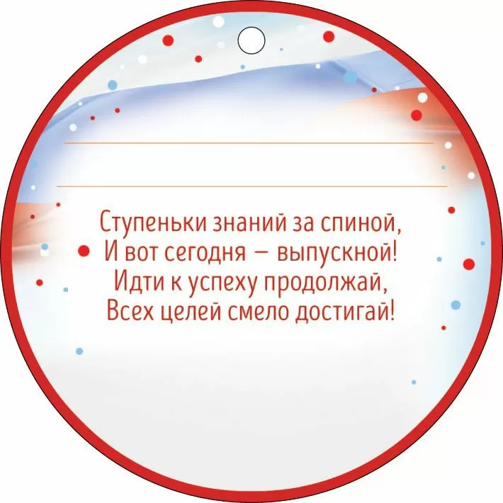 Подарочная медаль-открытка — это небольшая круглая карточка формата А7. На лицевой стороне отпечатан красочный рисунок, а на обороте есть поздравительный стих с теплыми пожеланиями. Сверху на ордене – небольшое отверстие под декоративный шнурок или атласную ленточку. Обратите внимание — шнурок и лента в комплект не входят!