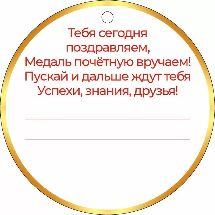 Подарочная медаль-открытка — это небольшая круглая карточка формата А7. На лицевой стороне отпечатан красочный рисунок, а на обороте есть поздравительный стих с теплыми пожеланиями. Сверху на ордене – небольшое отверстие под декоративный шнурок или атласную ленточку. Обратите внимание — шнурок и лента в комплект не входят!
