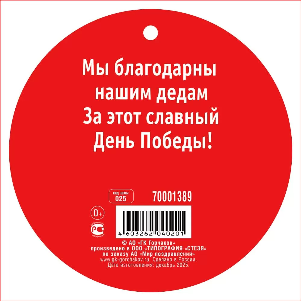 Медаль картонная формата D 94 предназначена для оформления мероприятий, посвящённых 9 Мая, и может использоваться как элемент награждения школьников, участников тематических конкурсов и классных часов, а также как декоративный знак для оформления залов и стендов. Изделие выполнено из плотного картона, обеспечивающего стабильную форму и достаточную жёсткость при краткосрочной и разовой эксплуатации в условиях школьных и массовых мероприятий. Круглая медаль диаметром 94 мм имеет двустороннее изображение: на лицевой стороне размещена композиция с символикой Дня Победы, георгиевской лентой и гвоздиками на красном фоне, а также поздравительная надпись, оборотная сторона может использоваться для подписи, указания класса, школы, номинации или даты проведения мероприятия. Поверхность защищена глянцевым УФ-лаком, что повышает устойчивость к истиранию красочного слоя, делает изображение более износостойким при контакте с руками и уменьшает риск выцветания при кратковременном воздействии света. Небольшой диаметр и малый вес изделия удобны при транспортировке и хранении крупными партиями, медали компактно размещаются в коробках и не создают значительной нагрузки на подвесные элементы, такие как ленты или шнуры. Конструкция предусматривает отверстие для крепления, что упрощает использование в качестве наградного аксессуара или подвесного декоративного элемента. Формат и нейтральный дизайн позволяют включать данную медаль в ассортимент сувенирной и школьной праздничной продукции, сочетать с другими позициями к 9 Мая и использовать как массовый раздаточный материал. В упаковке — 20 изделий, что удобно для планирования закупок под класс, параллель или небольшое школьное мероприятие, а также для формирования стандартных оптовых лотов.