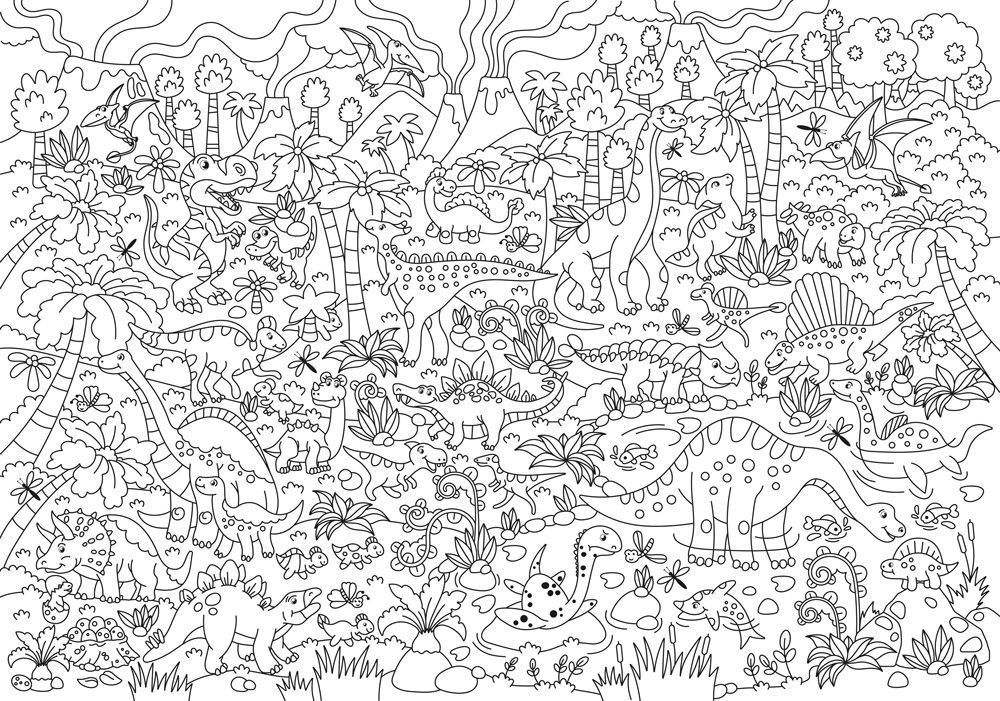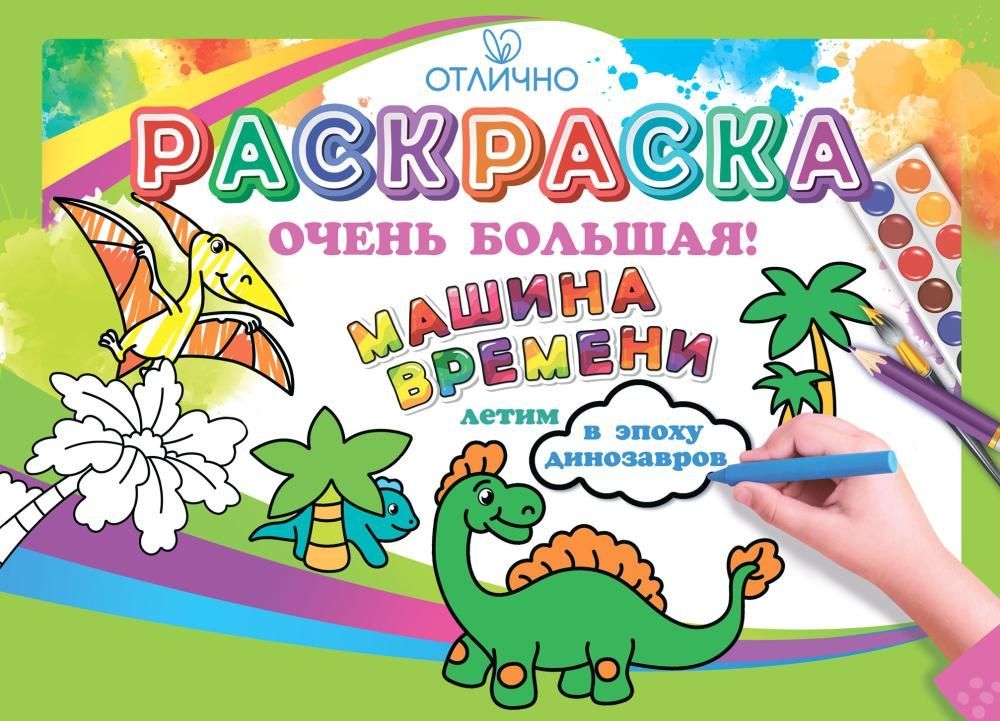 Раскраска большая «Машина времени. Летим в эпоху динозавров» (динозавры, пальмы)