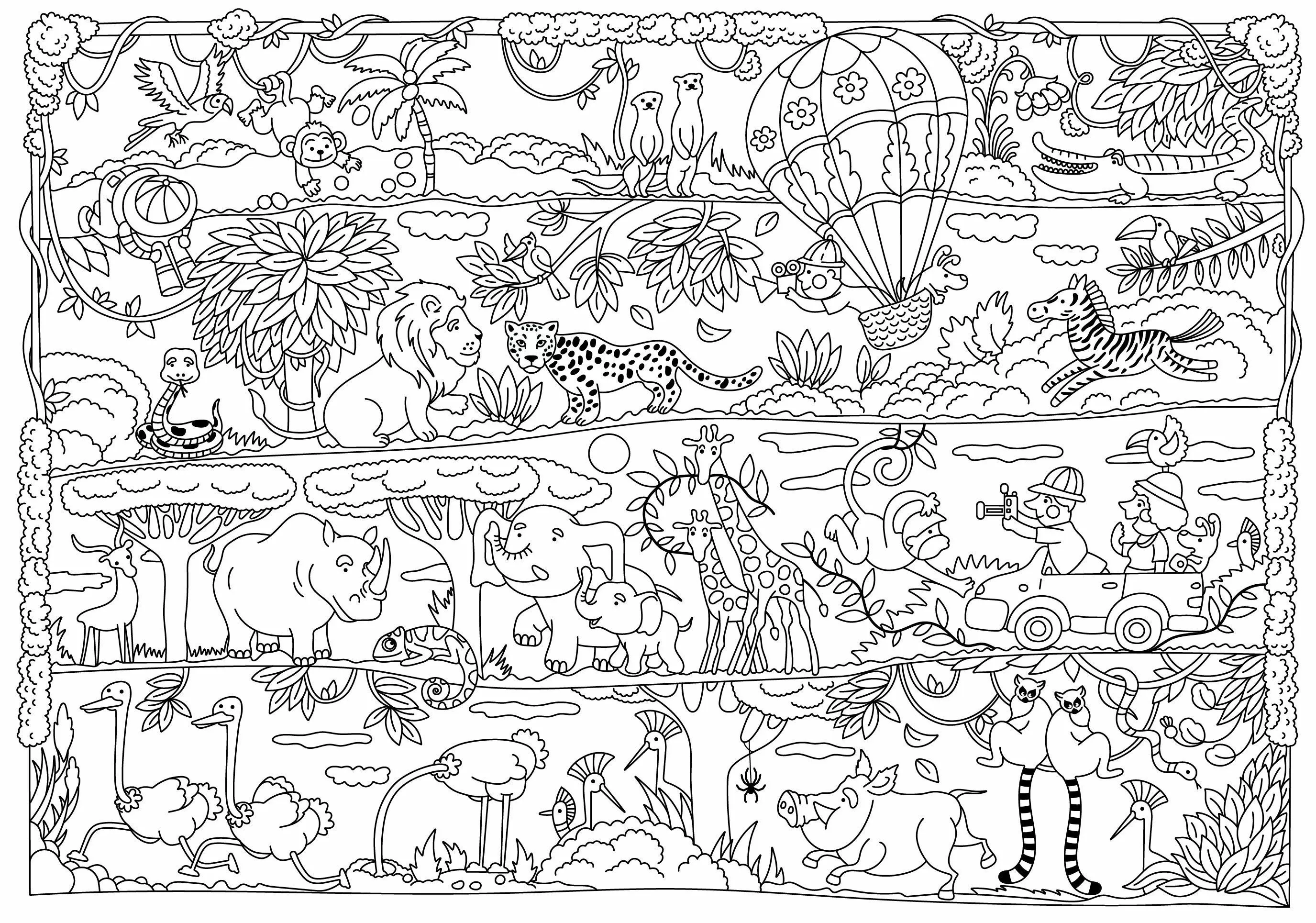 Любопытный сюжетный рисунок надолго увлечет ребенка. Картинку интересно рассматривать и сочинять увлекательные истории о путешествии в жаркие страны и знакомстве с экзотической природой. У детей развивается фантазия, мелкая моторика и чувство прекрасного, вырабатывается усидчивость и внимательность, а взрослые в это время отдыхают.