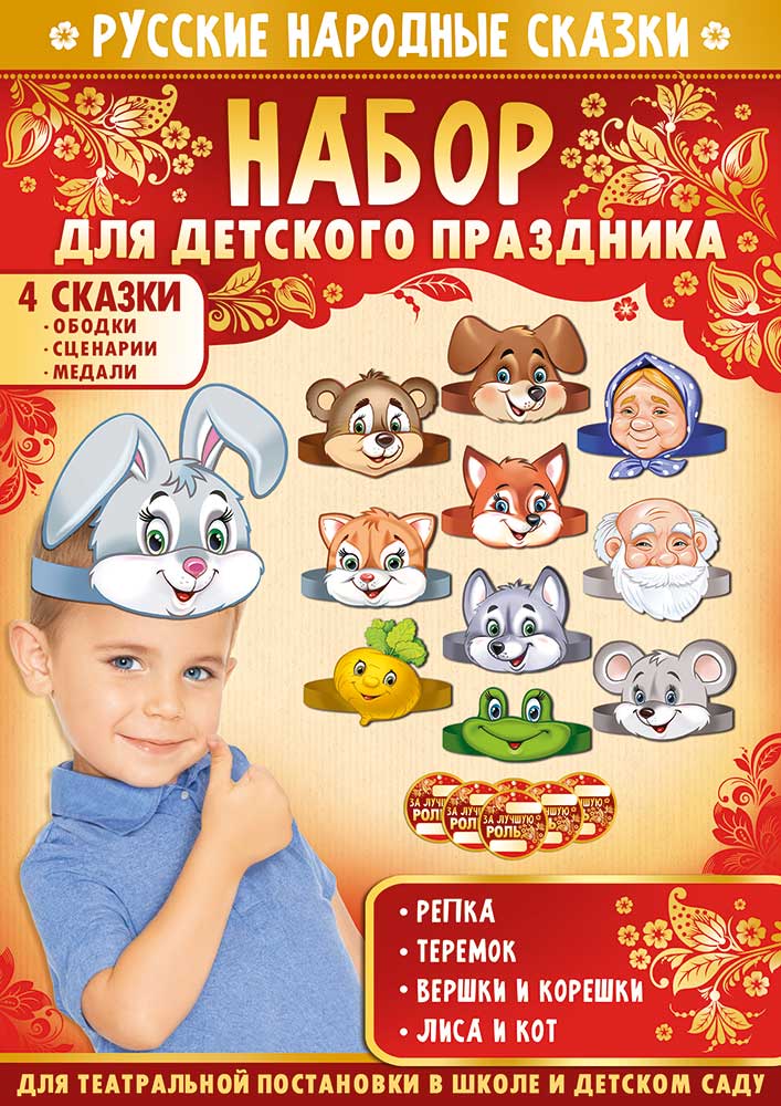 Игровой набор «Русские народные сказки. Набор для детского праздника» представляет собой готовое решение для проведения театрализованных постановок и тематических мероприятий с детьми. Изделие выполнено из плотного картона формата А4 с двусторонним изображением, что обеспечивает чёткую цветопередачу и сохранение рисунка при визуальном восприятии с разных сторон. Размер готового изделия 297×210 мм позволяет удобно размещать элементы в стандартных папках и на стеллажах, что важно при складском хранении и транспортировке в оптовых партиях. В набор входит 17 элементов: картонные ободки-маски с персонажами русских народных сказок и дополнительные игровые детали, рассчитанные на использование в сценариях «Репка», «Теремок», «Вершки и корешки», «Лиса и кот». Конструкция с дополнительным элементом обеспечивает вариативность использования: ободки могут применяться как базовый реквизит для утренников, конкурсов, театральных постановок в детском саду, школе, кружках и студиях, а также для домашних игр. Картонная основа оптимальна по соотношению жёсткости и массы, выдерживает многократное надевание и снятие при аккуратной эксплуатации, не создаёт избыточной нагрузки при пересылке и хранении. Внутри предусмотрен текст-подсказ, который упрощает подготовку сценариев и распределение ролей, что особенно удобно для педагогов, аниматоров и организаторов детских мероприятий при планировании репертуара. Набор рассчитан на единичное использование в рознице и на формирование широкой полочной матрицы в оптовом сегменте: компактный формат, единый стилистический дизайн и стандартизированные размеры позволяют эффективно комплектовать ассортимент, транспортировать и учитывать товар. Количество в упаковке 1.
