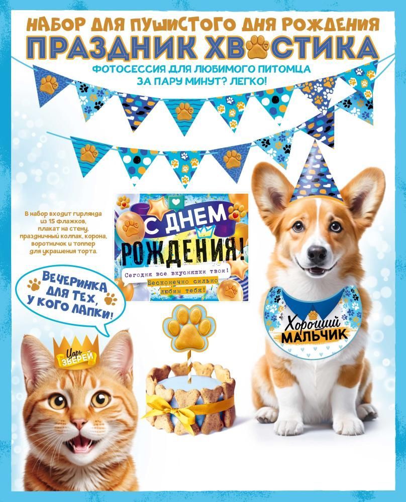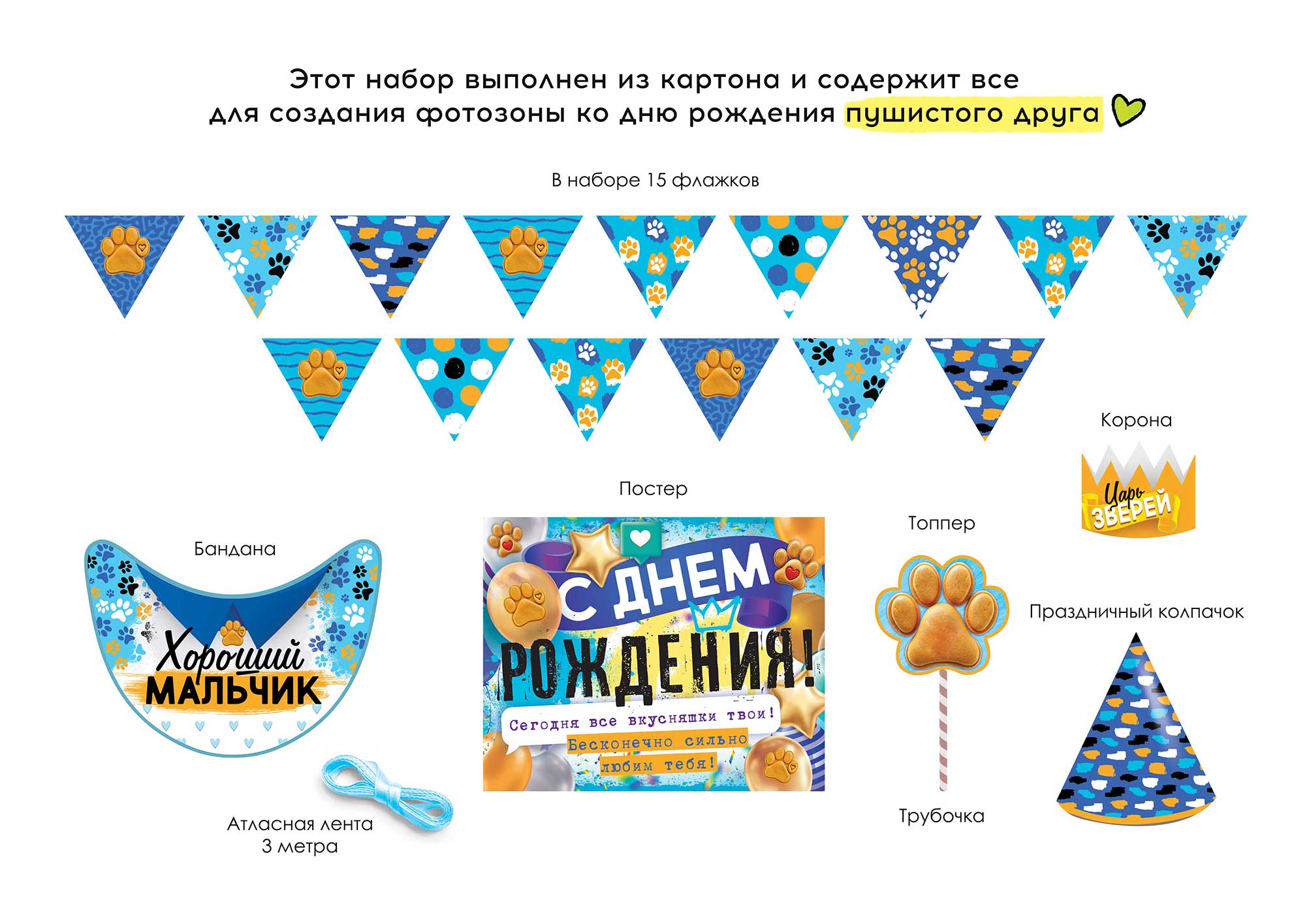 Набор оформительский формата А1 предназначен для оформления дня рождения домашнего питомца и организации фотозоны. Изделие выполнено из плотного картона с фигурной вырубкой, что обеспечивает точную геометрию элементов и аккуратный внешний вид при сборке. В набор входит 23 элемента без внутреннего текста, что удобно для оптовых покупателей, работающих с широкой аудиторией: оформление не привязано к конкретному имени животного и подходит для различных сценариев использования в розничных зоомагазинах, фотостудиях и сервисах по организации праздников. Основные детали рассчитаны на оформление стены или фона для фотографирования, а также на создание аксессуаров для собаки или кошки, включая декоративные элементы для шеи и головы, праздничное оформление миски или угощения. Готовое изделие имеет длину около 700 мм и ширину 530 мм, что позволяет использовать его как самостоятельный центральный элемент декора или комбинировать с другими позициями ассортимента. В комплект включён шнур длиной 3000 мм, а также конструктивные элементы: атласная лента, резинка, трубочка и скотч, что сокращает дополнительные затраты при массовых закупках и упрощает монтаж на месте проведения мероприятия. Глянцевая отделка ВД-лаком повышает износостойкость поверхности, улучшает цветопередачу и делает картон более устойчивым к случайным загрязнениям и трению, что важно при многократном использовании в аренде или в демонстрационных зонах магазина. Небольшое количество элементов и продуманный крепёж обеспечивают быстрый монтаж и демонтаж, удобство транспортировки и компактное хранение на складе, а также позволяют конечному пользователю самостоятельно собрать украшение без специального оборудования. Количество в упаковке: 1.