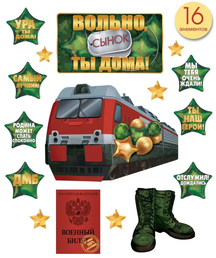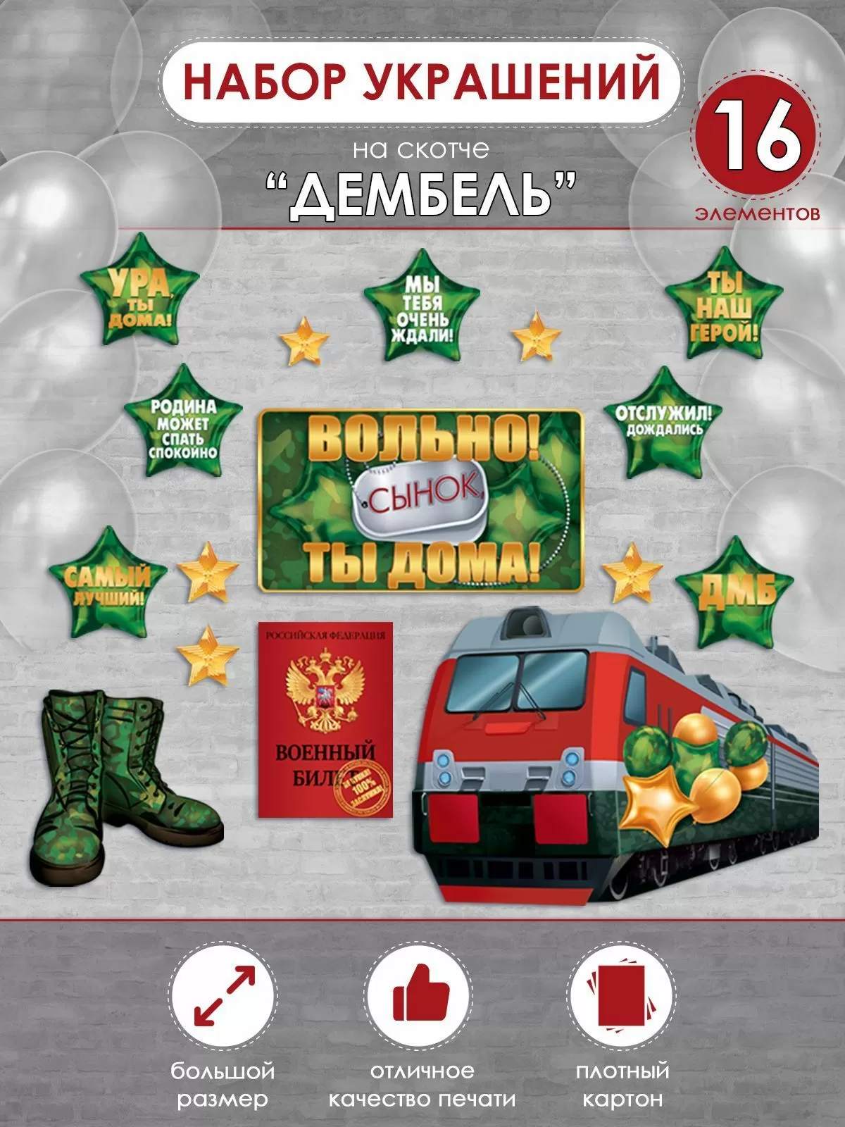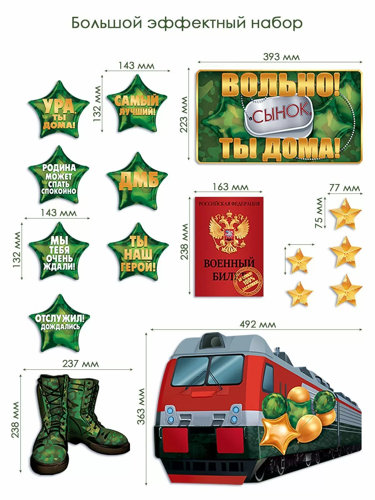 Праздничный комплект станет незаменимым атрибутом для оформления дома, зала торжеств или другого места встречи солдата. Он подойдёт для родителей, друзей, супругов, которые хотят подарить демобилизованному солдату яркие эмоции. Красочные детали, военная символика и трогательные надписи делают этот набор универсальным решением для создания запоминающейся обстановки.