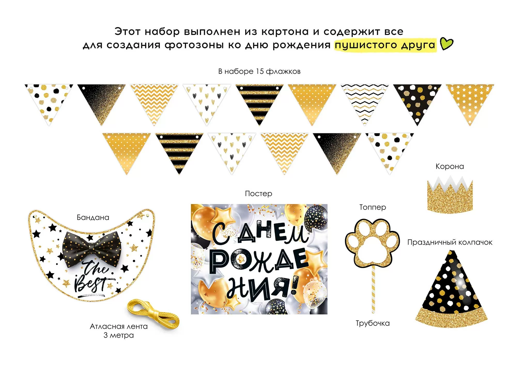 В комплекте гирлянда из 15 флажков, постер, праздничный колпак, корона, воротничок и топпер для украшения торта (+ атласная ленточка и двусторонний скотч). Материал – плотный картон.