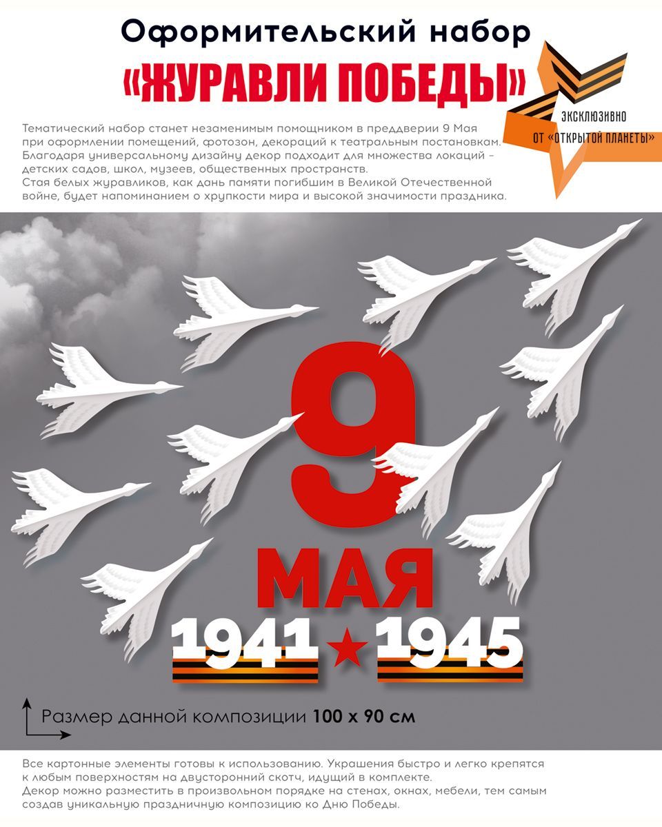 Набор оформительский представляет собой комплект из 17 элементов для тематического оформления к 9 Мая, выполненных из плотного картона формата А0. Габариты готовой композиции составляют примерно 1000 × 900 мм, что позволяет использовать изделие для оформления витрин, входных групп, стен и информационных зон в торговых залах, офисах, образовательных и культурных учреждениях. Визуальная композиция включает крупную центральную дату «9 Мая», годы «1941–1945», декоративную звезду и стилизованное изображение журавлей на нейтральном фоне, что обеспечивает хорошую читаемость с расстояния и подходит для размещения в просторных помещениях. Картон имеет достаточную жёсткость для сохранения формы при вертикальном монтаже, не деформируется при кратковременных перепадах влажности и температуры в стандартных интерьерных условиях, что удобно при сезонном использовании и многократных переустановках. В комплект входит двусторонний скотч для крепления элементов на гладкие поверхности; это снижает трудозатраты при массовом оформлении и позволяет монтировать набор без дополнительного оборудования и специальных навыков. Элементы фигурной вырубки аккуратно обработаны по контуру, без заусенцев и надрывов, что облегчает быструю раскладку и уменьшает риск повреждения при транспортировке и хранении. Отсутствие печатного текста внутри и нейтральная цветовая гамма фона делают набор универсальным для использования в различных типах помещений, включая объекты с уже существующей навигацией или брендированием. Для розничного применения набор удобен тем, что позволяет быстро оформить домашний интерьер, подъезд, класс или кабинет к памятной дате, при этом отдельные элементы можно располагать в произвольной композиции, подстраивая размер и конфигурацию под конкретную площадь. Количество в упаковке: 1.