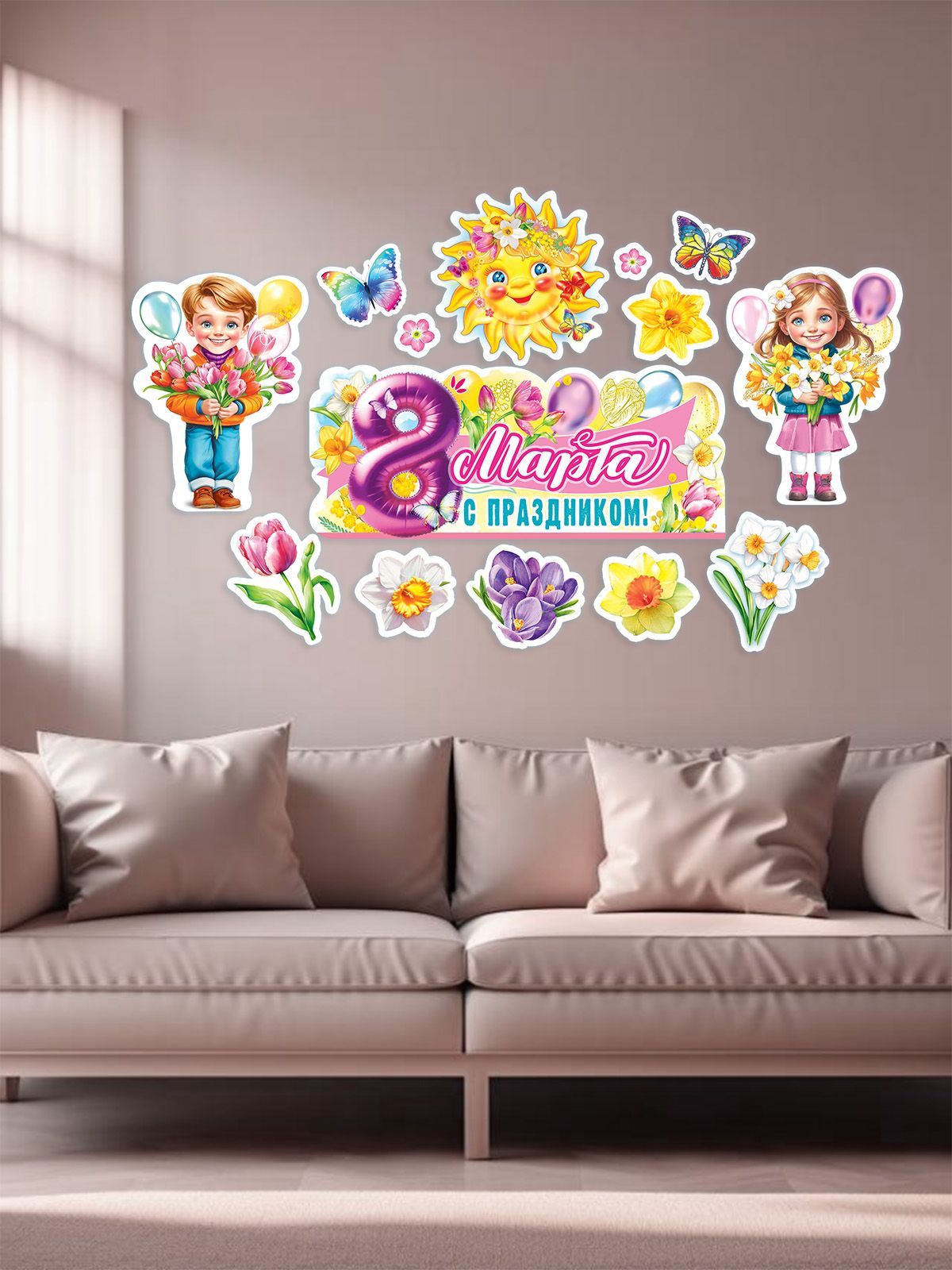 Набор оформительский формата А0 предназначен для быстрого и аккуратного оформления помещений к празднику 8 Марта в образовательных учреждениях, торговых залах, офисах и дома. Основа изделий выполнена из плотного картона, обеспечивающего стабильную геометрию фигур при размещении на стенах и других вертикальных поверхностях, а также устойчивость к незначительным механическим воздействиям при многократном использовании в течение сезона. Фигурная вырубка по контуру иллюстраций придаёт композиции законченный вид и позволяет комбинировать элементы в зависимости от площади и конфигурации помещения. В набор входят крупные декоративные элементы с изображением детей с букетами, центральная композиция «8 Марта» и дополнительные детали с цветами, бабочками и солнцем, что даёт возможность формировать как единое панно, так и разнесённое оформление на нескольких участках стены, дверях или витринных поверхностях. Готовое изделие рассчитано на размещение в габаритах 1500 × 1000 мм, что важно учитывать при планировании экспозиции и подборе сопутствующей печатной продукции в ассортименте. Конструктив выполнен на подложке; в комплект входит скотч, что сокращает подготовительное время при массовом оформлении и позволяет монтировать элементы без дополнительных расходных материалов. Отделка отсутствует, поверхность матовая, без бликов, хорошо читаемая при любом освещении и пригодная для фотографирования интерьеров. Изображения насыщенные, с чёткой прорисовкой деталей, визуально выделяются на расстоянии и подходят для использования в крупных помещениях. Внутри элементов текст отсутствует, поэтому набор можно сочетать с отдельными поздравительными надписями, табличками режимов работы и другой информационной продукцией, адаптируя оформление под разные форматы мероприятий. Количество в упаковке: 1.
