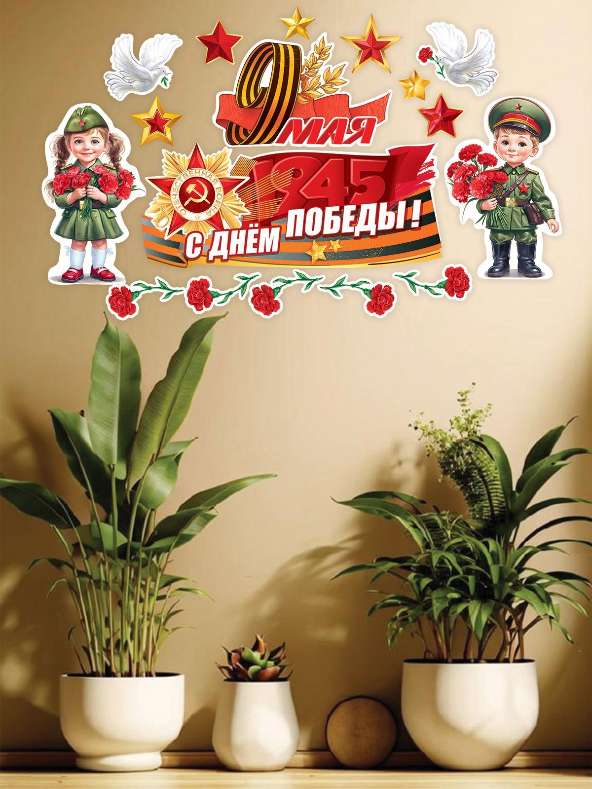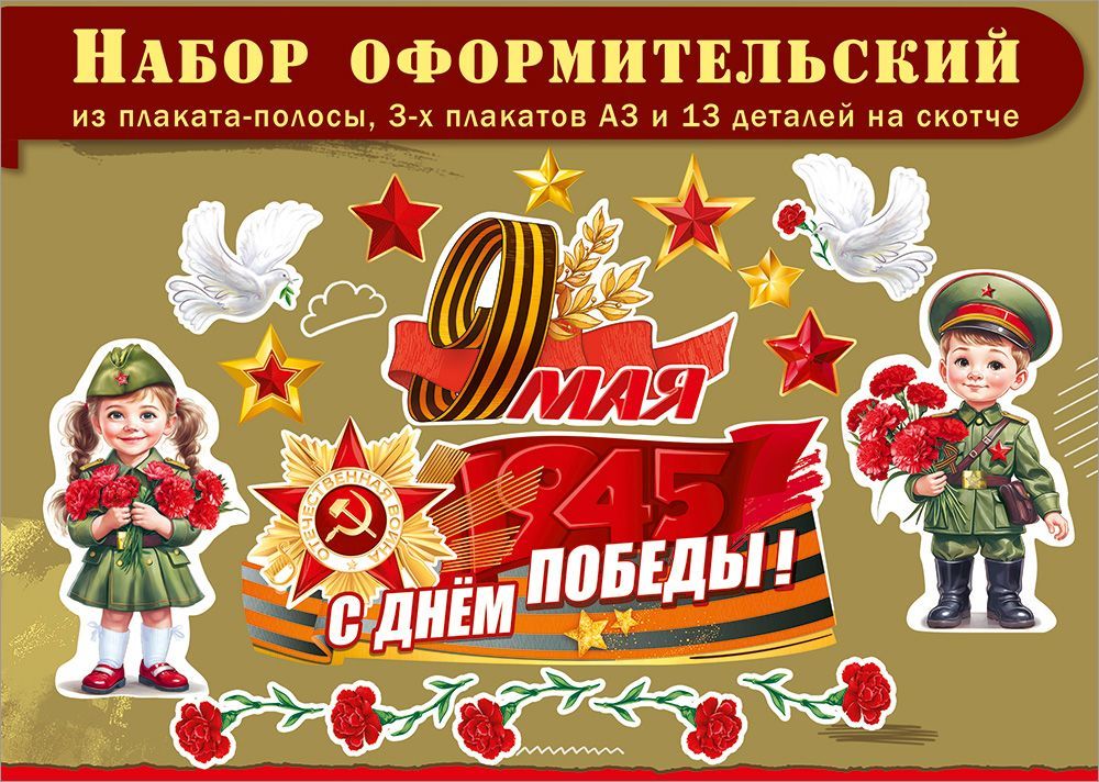 Набор оформительский формата А0 предназначен для быстрого и однородного оформления помещений к празднованию 9 Мая в образовательных учреждениях, офисах, торговых залах и зонах обслуживания. Готовое изделие размером 1300 × 1000 мм изготавливается из плотного картона, что обеспечивает стабильную геометрию, устойчивость к деформации и удобство при монтаже на вертикальные поверхности. В состав входят основные декоративные элементы с тематикой Дня Победы: крупная центральная композиция «9 Мая 1945» с георгиевской лентой, звёздами и символикой Победы, а также дополнительные фигурные элементы с детьми в военной форме, голубями, гвоздиками и декоративными звёздами. Фигурная вырубка позволяет получить аккуратные контуры без необходимости дополнительной подрезки, что сокращает время подготовки оформления при больших объёмах работ. Конструкция набора выполнена на подложке, в комплект включён скотч для крепления, поэтому монтаж возможен без использования дополнительных расходных материалов и инструмента, что удобно для серийного оформления нескольких объектов. Материал подобран таким образом, чтобы выдерживать краткосрочную сезонную эксплуатацию в помещениях с нормальной влажностью и освещением, сохраняя цветопередачу и форму на протяжении всего периода использования. Изделие поставляется в плоском виде, что упрощает хранение на складе, групповые отгрузки и транспортировку без повреждения краёв и заломов, а также позволяет рационально использовать паллетное пространство. Набор не содержит текста внутри отдельных элементов, что обеспечивает визуальную целостность композиции и делает его удобным для использования в помещениях с различной информационной нагрузкой. Количество в упаковке: 1.