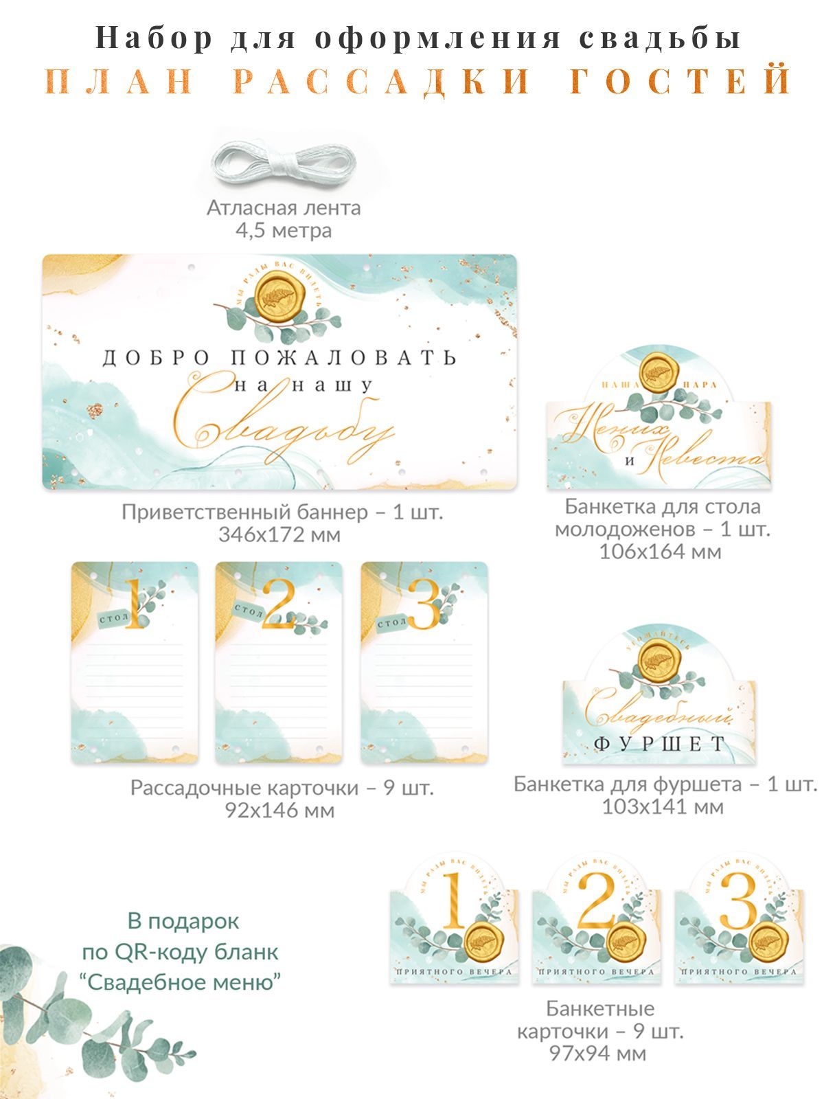 План рассадки стильно выглядит и комфортен для заполнения. Комплект рассчитан на 90 человек (9 столов). В набор входят приветственный баннер, 9 бланков для 10 имен каждый, 9 банкетных карточек с номерами столов, 1 банкетная карточка для фуршета, 1 банкетная карточка для стола молодоженов и атласная лента для фиксации рассадочных карточек.