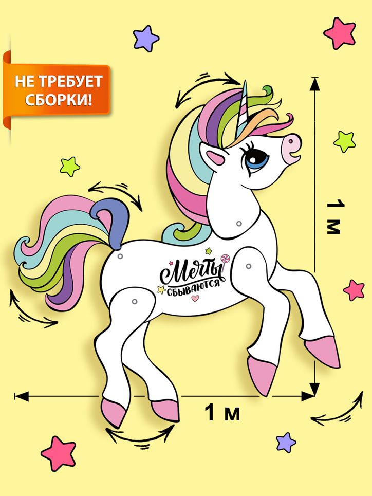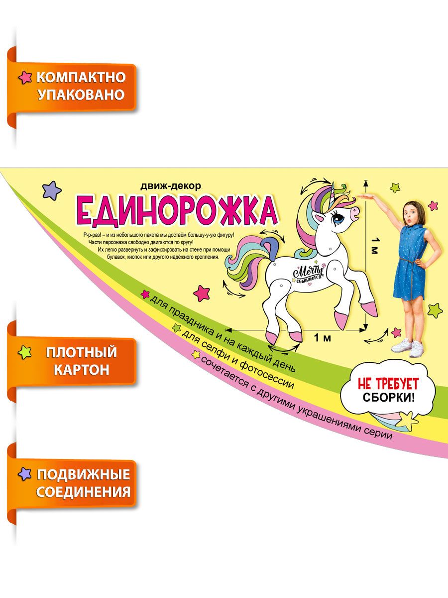 Набор оформительский представляет собой крупноформатное декоративное изделие из картона формата А0 с фигурной вырубкой в виде единорога размером 1000 × 1000 мм. Конструкция выполнена из плотного картонного материала с печатным рисунком устойчивыми красителями, что обеспечивает сохранение цвета при стандартном внутреннем освещении и аккуратной эксплуатации. Элементы тела соединены подвижными креплениями, за счет чего возможно изменение положения ног и головы, что удобно для витринного и интерьерного оформления, создания динамичных композиций и фотозон. Изделие поставляется полностью готовым к использованию, не требует сборки и дополнительных инструментов, что снижает трудозатраты персонала при массовом оформлении залов, детских центров, торговых точек и мероприятий. Поверхность имеет аккуратную отделку, контур вырубки соответствует иллюстрации без смещений и рваных краев, что важно при серийной выкладке и комбинировании с другими элементами декора. Размер 1 × 1 м позволяет использовать набор как центральный акцент композиции на стене, перегородке или фотозоне, при этом изделие остается достаточно легким для крепления стандартными офисными средствами. Для розничного применения набор подходит для оформления детских комнат, домашних праздников и тематических дней рождения: крупный формат хорошо читается в помещении среднего размера, подвижные части позволяют менять позу фигуры и адаптировать декор к сценарию мероприятия. Картонная основа удобна при хранении и транспортировке, изделие можно располагать в плоском виде, защищая от влаги и механических повреждений. В упаковке — 1.