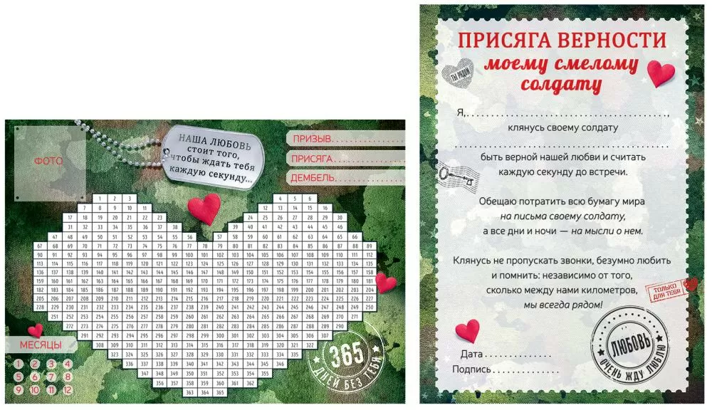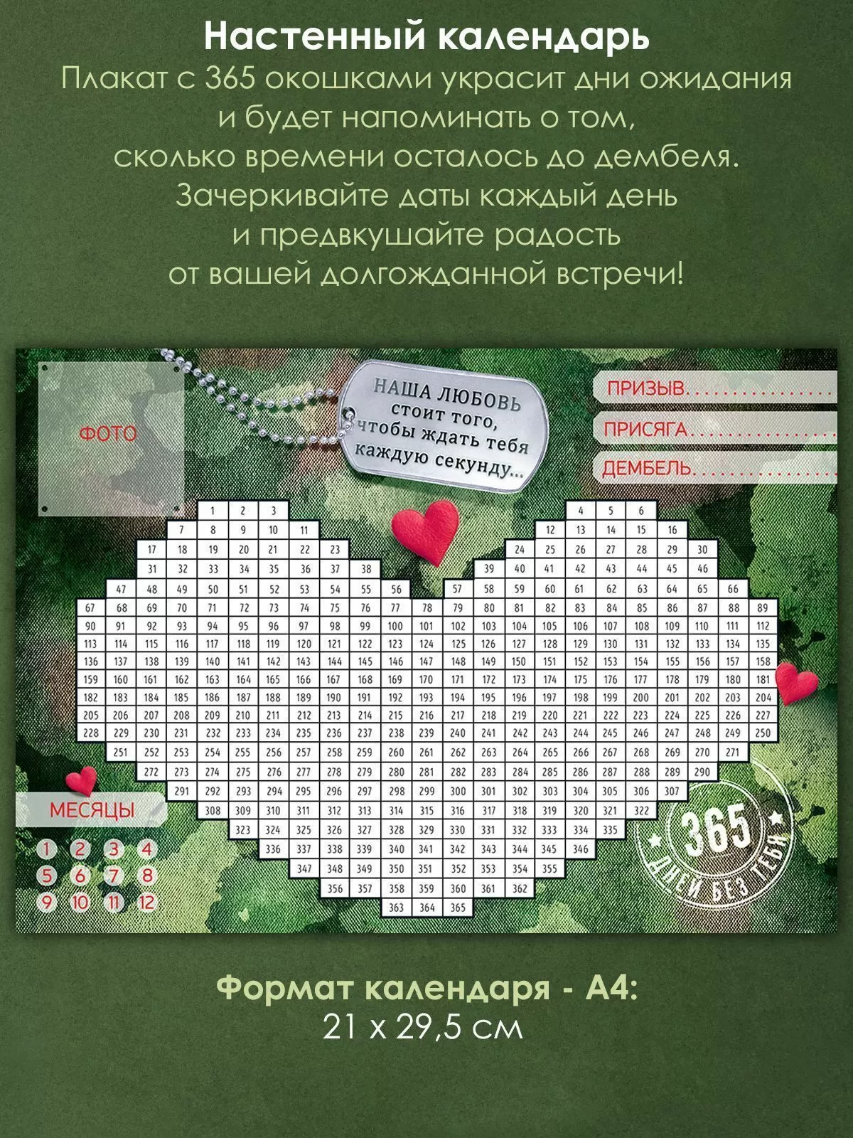 Второй плакат – это своеобразный календарь обратного отсчета до заветного дембеля. В центре изображено большое сердце, разделенное на 365 клеточек, которые можно зачеркивать или раскрашивать, с нетерпением считая дни до долгожданной встречи. Есть специально отведенное место для фотографии, что позволяет сделать дизайн еще более индивидуальным.
