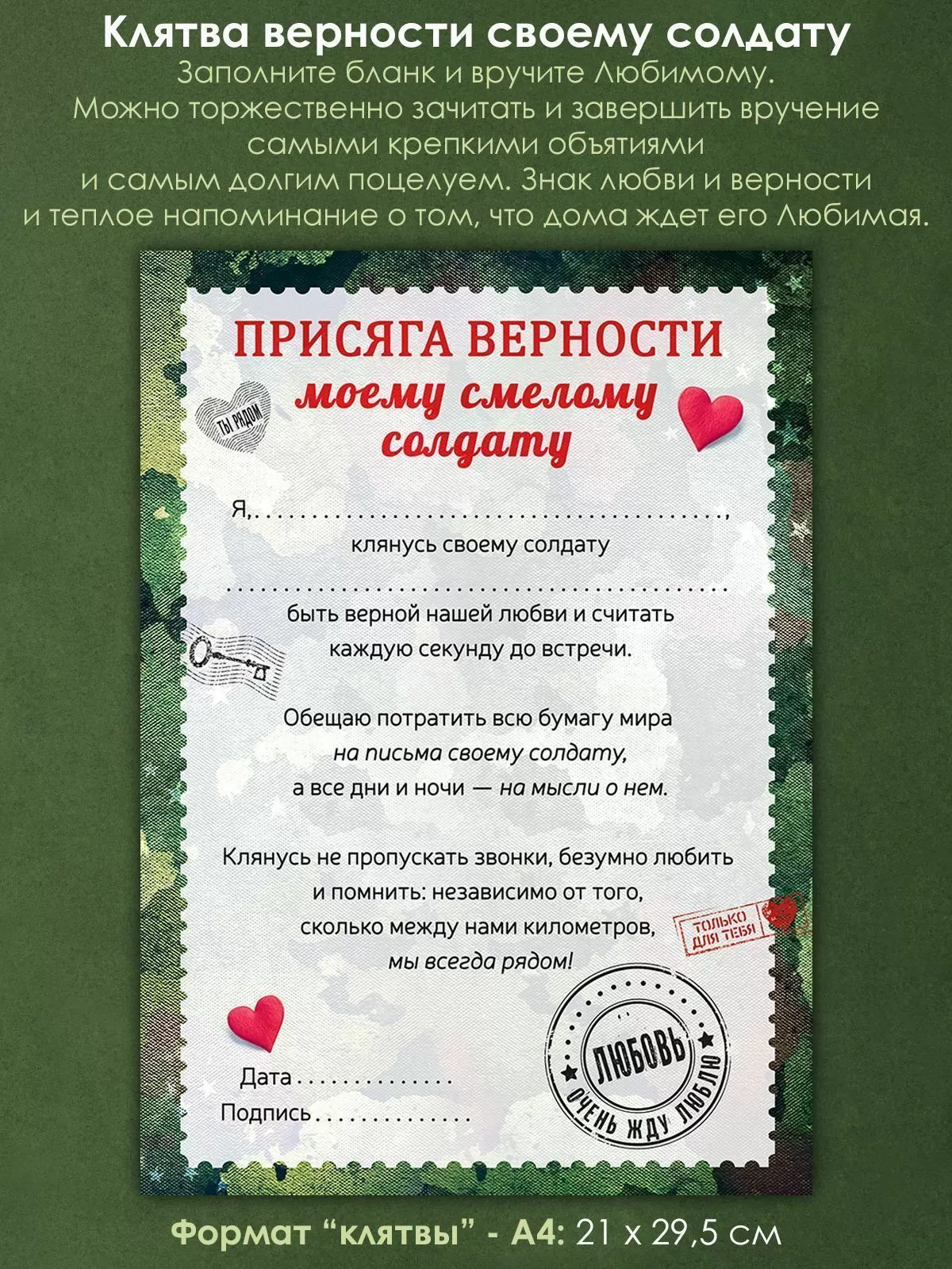 Первый плакат с клятвой верности оформлен в виде торжественного обещания, которое девушка может заполнить самостоятельно. Теплые слова о преданности и ожидании помогут выразить самые искренние чувства. В нижней части предусмотрено место для даты и подписи, что делает этот символичный обет особенно личным.