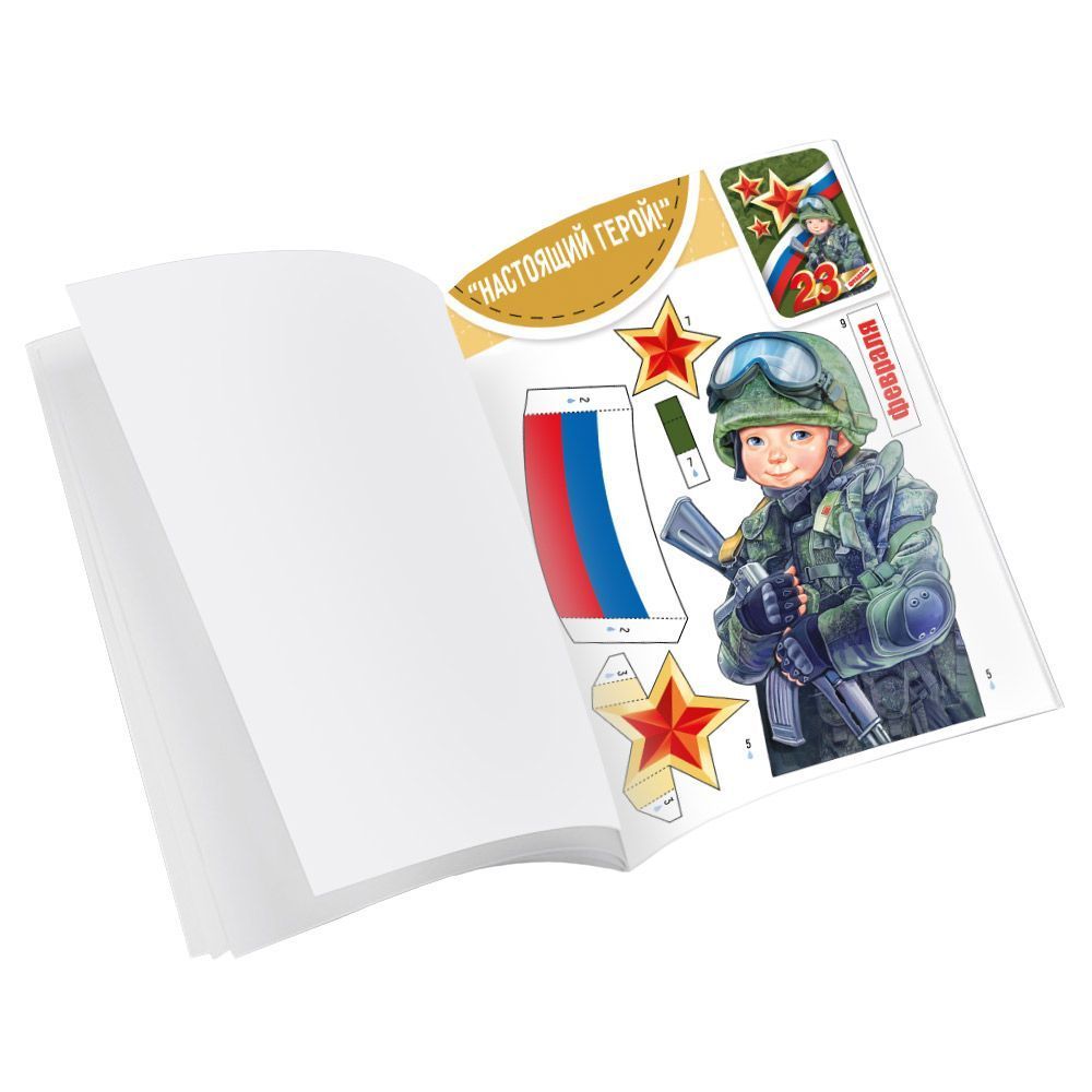 Набор для творчества формата А4 представляет собой комплект бумажных заготовок для изготовления объемных 3D-аппликаций на тему праздника 23 Февраля. Внутри размещены четыре полноцветные композиции с тематикой Дня защитника Отечества, каждая на отдельном листе, с четко прорисованными контурами элементов для вырезания и пошаговыми подсказками по сборке. Материал изготовления – плотная офсетная или мелованная бумага, обеспечивающая стабильную геометрию деталей при вырезании, сгибании и наклеивании, а также достаточную жесткость готового изделия для настенного размещения или использования в качестве открытки-панно. Конструктив на скрепке упрощает хранение и учет на складе, позволяет листать и отбирать нужные листы, при этом блок надежно закреплен и выдерживает многократное использование в учебных и кружковых занятиях. Готовое изделие имеет размеры 294×210 мм, что соответствует стандартному формату А4 и удобно для размещения в файловых папках, прозрачных конвертах и стандартных рамках, что важно при планировании ассортимента и витринной выкладки. Отделка без отделки делает набор универсальным для тиражных закупок: отсутствуют элементы, требующие деликатной транспортировки, изделия устойчивы к типичным логистическим нагрузкам и не требуют специальных условий хранения. Набор рассчитан на использование в детских коллективах, школах, студиях дополнительного образования и дома: из одного экземпляра можно организовать несколько индивидуальных или групповых занятий по аппликации, развивая аккуратность, мелкую моторику и навыки работы с бумагой. Готовые работы могут применяться как поздравительные плакаты, элементы настенного оформления к 23 Февраля или персонализированные подарки. Внутренний текст-подсказ служит инструкцией по сборке и размещению деталей, что снижает нагрузку на педагога или организатора мероприятия и делает результат предсказуемым даже при массовом использовании. Количество в упаковке: 1.