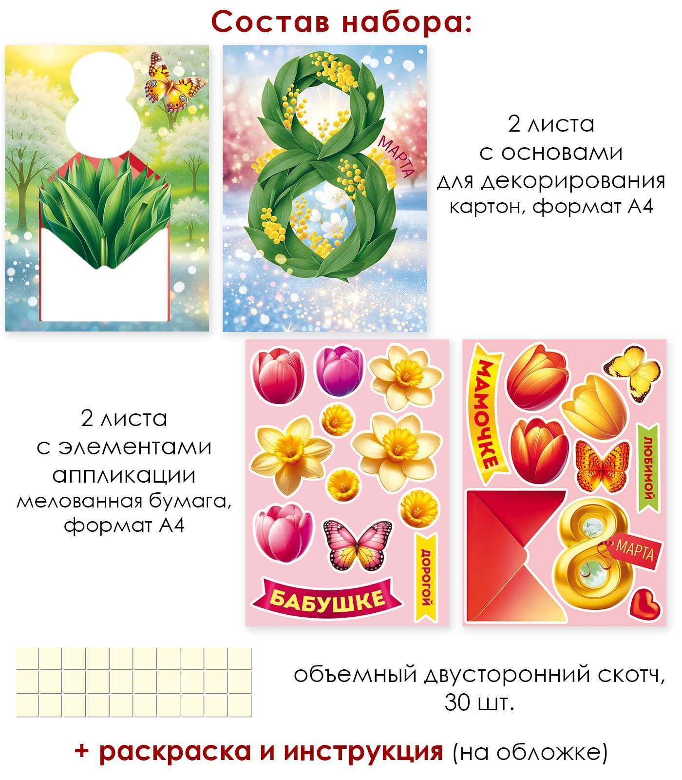 Набор развивающий формата А4 предназначен для изготовления аппликаций и творческих работ с детьми и подходит для использования в учебных и досуговых учреждениях, а также в домашней обстановке. В комплект входит 4 элемента из плотного картона: основы с красочными иллюстрациями и дополнительные детали для вырезания и наклеивания, что позволяет организовать простую поэтапную работу без необходимости подбора дополнительных заготовок. Материал изготовления подобран таким образом, чтобы выдерживать многократные механические нагрузки при вырезании, сгибании и приклеивании, не деформируясь и сохраняя геометрию деталей, что важно при серийных закупках для кружков, детских садов и начальной школы. Отсутствие отделки упрощает переработку и снижает риск повреждений при хранении и транспортировке, изделия удобно штабелируются благодаря стабильному размеру 295×210 мм, что соответствует стандартному формату А4 и позволяет размещать наборы в типовых коробах и стеллажах. Набор не содержит текста внутри, поэтому может использоваться в группах с разным уровнем чтения и в двуязычной среде, а готовые работы универсальны по оформлению и подходят для тематических занятий к 8 Марта, изготовлению поздравительных композиций для мам и бабушек, оформлению стендов и выставок детского творчества. Для розничного покупателя изделие представляет собой готовое решение для совместного занятия с ребёнком: понятная структура набора, наглядный пример на обложке и ограниченное количество элементов упрощают организацию процесса, позволяют развивать мелкую моторику, аккуратность и навыки работы с бумагой без перегрузки лишними деталями. Нейтральная картонная основа совместима с большинством распространённых клеевых материалов, безопасных ножниц и декоративных элементов, что расширяет возможности комбинирования с другими позициями ассортимента и облегчает планирование закупок в оптовом сегменте. Количество в упаковке — 1.