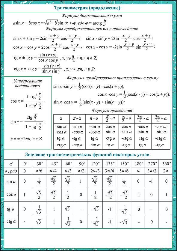 Шпаргалка представляет собой комплект из 10 двусторонних карточек формата А5 размером 210 × 148 мм, изготовленных из плотного картона без дополнительной отделки. Изделие ориентировано на систематизацию и оперативный доступ к базовым формулам по алгебре, в том числе по разделу тригонометрии: на лицевых и оборотных сторонах размещены основные тождества, формулы сложения, преобразования суммы в произведение, формулы кратных и половинных углов, значения тригонометрических функций, сведения о четности функций, а также данные по арксинусу, арккосинусу, арктангенсу и арккотангенсу. Плотный картон обеспечивает жесткость и устойчивость к износу при регулярном использовании учениками и преподавателями, карточки не деформируются при хранении в стопке, папке или коробе, удобны для перевозки в учебных наборах и оптовых поставках в учебные центры и школы. Точная подрезка по формату А5 позволяет без затруднений размещать шпаргалки в стандартных файлах, скоросшивателях и настольных органайзерах, а также комбинировать их с другой учебной печатной продукцией аналогичного размера. Печать текста выполнена с четкой проработкой формул и таблиц, что облегчает чтение с расстояния рабочего стола, повышает удобство использования при фронтальной работе в классе или при самостоятельной подготовке. Комплект может применяться как вспомогательный раздаточный материал на уроках, при проведении занятий в кружках и на курсах, а также как настольная подсказка для домашних занятий, подготовки к контрольным и экзаменам. Для розничного пользователя изделие удобно тем, что все ключевые формулы собраны в компактном формате, который легко хранить в папке вместе с тетрадями и учебниками, при этом картонная основа выдерживает многократное перелистывание и использование в течение нескольких учебных лет.