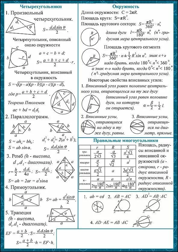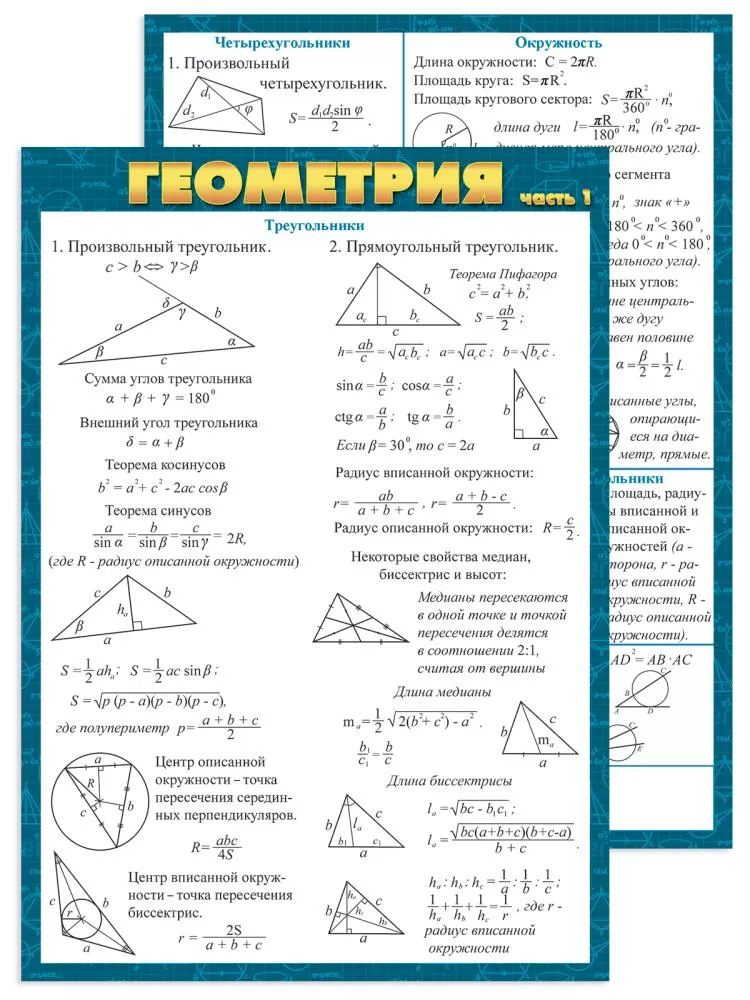 Карточка-шпаргалка формата А5 с основными правилами геометрии - очень полезная вещь каждому ученику старших классов. Ничего лишнего, что могло бы отвлечь: лаконичный дизайн, строгое цветовое оформление - это именно то, что необходимо для быстрого запоминание нужной информации. Благодаря удобному формату, вы можете вложить карточку в тетрадь или учебник, чтобы в нужный момент она оказалась под рукой. Незаменимый помощник в учёбе.