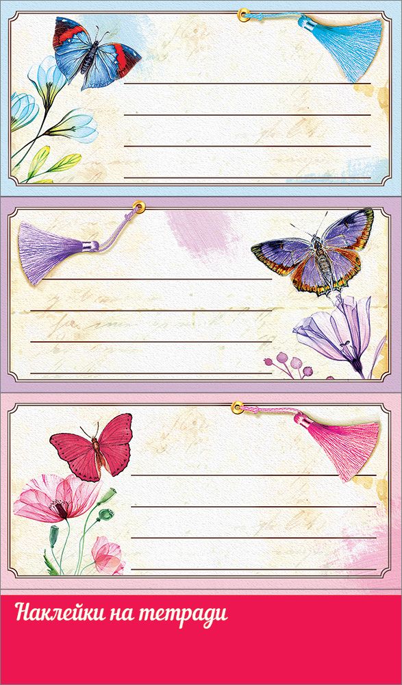Наклейка формата А6 изготовлена из самоклеящейся бумаги и предназначена для маркировки школьных и рабочих тетрадей, блокнотов, папок и других бумажных носителей. Основа обеспечивает надежное приклеивание к большинству гладких поверхностей, стандартная толщина материала удобна для массового использования и не утолщает обложку. На лицевой стороне размещены три прямоугольные этикетки с полями для внесения текста; каждая зона имеет несколько строк для указания фамилии, класса, предмета или другого идентификатора, что облегчает систематизацию большого количества однотипных изделий в учебных заведениях, офисах и на складах. Декор выполнен в единой серии с изображениями бабочек, цветов и декоративных кисточек в пастельной гамме, что позволяет использовать наклейки в розничном сегменте как аккуратные подписи к школьным тетрадям, личным дневникам и альбомам, сохраняя при этом нейтральный, уместный в учебной среде внешний вид. Размер готового изделия 155 × 91 мм обеспечивает совместимость с большинством стандартных форматов тетрадей и папок, удобен для хранения в ящиках, лотках и коробах оптового склада и не требует дополнительной подрезки. Поверхность без отделки пригодна для письма шариковыми и гелевыми ручками, капиллярными и простыми карандашами, что важно при поточном заполнении в школе или офисе. В упаковке 20 единиц, что позволяет формировать экономичные партии для сетевой и розничной торговли, учебных центров и корпоративных закупок, а также поддерживать стабильный ассортимент в линейке канцелярских наклеек без необходимости частого пересмотра складских остатков. Текст подсказ внутри.