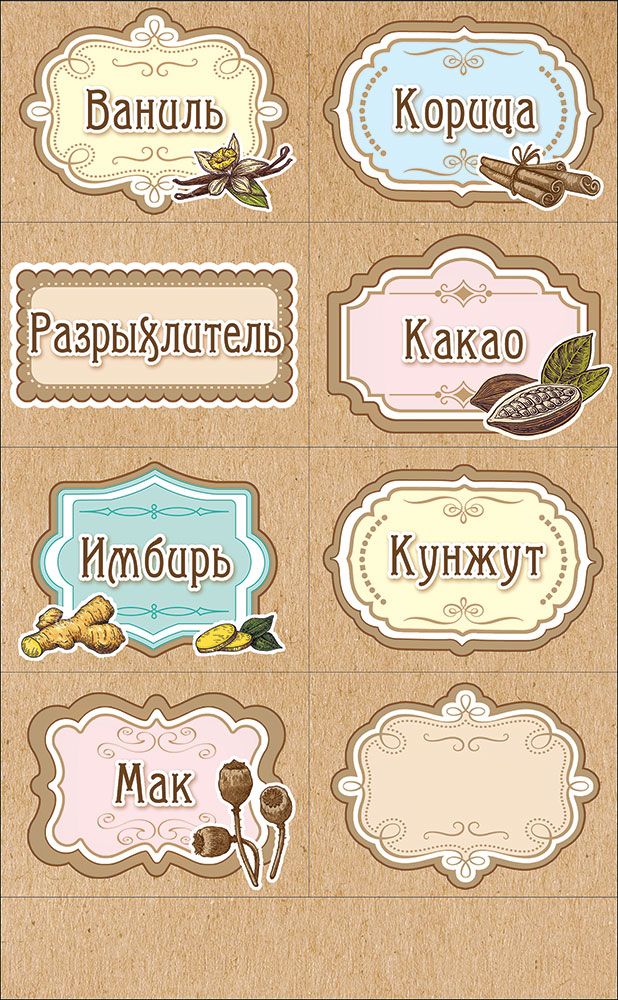 Наклейка формата А4 представляет собой лист фигурно вырубленных этикеток из самоклеящейся бумаги с уже нанесённым текстом для маркировки кулинарных ингредиентов. На одном листе размещены отдельные ярлыки с подписями «Ваниль», «Корица», «Разрыхлитель», «Какао», «Имбирь», «Кунжут», «Мак», а также одна этикетка без текста для произвольного обозначения содержимого. Каждая наклейка имеет декоративную рамку и иллюстрацию соответствующего продукта, что облегчает визуальную идентификацию при хранении и работе на кухне. Материал основы подобран для уверенного сцепления с гладкими поверхностями стеклянных банок, пластиковых контейнеров и металлических крышек, при этом толщина самоклеящейся бумаги обеспечивает стабильную геометрию изделия и не деформируется при аккуратном наклеивании. Лист имеет размеры 234 × 146 мм, что удобно для размещения в стандартных папках или выдвижных ящиках при складском хранении, а также при транспортировке оптовых партий. Фигурная вырубка выполнена по контуру рамок и иллюстраций, поэтому этикетки легко отделяются от подложки без надрывов, что важно при поточном использовании в магазинах, кондитерских цехах и на производствах пищевой продукции малого формата. Отделка без дополнительного лака и тиснения позволяет при необходимости делать пометки поверх печати обычной ручкой или маркером, что удобно для указания даты фасовки или срока годности. Нейтральная цветовая гамма и классический шрифтовой рисунок делают наклейки универсальными для домашней кухни, кулинарных студий, тематических подарочных наборов и витринного оформления. В упаковке 20, что позволяет формировать экономичные оптовые закупки, планировать расход на серию однотипных контейнеров и поддерживать единый стиль маркировки в ассортименте.