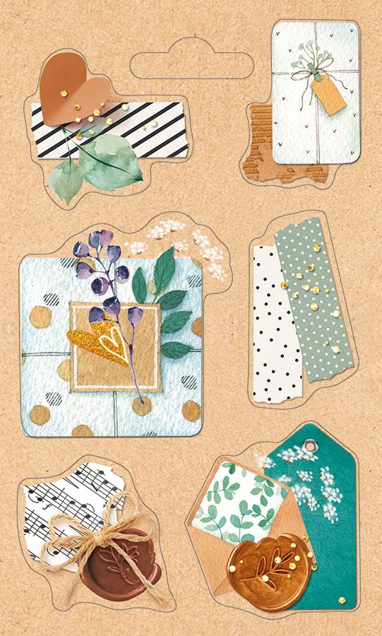 Наклейка формата А5 изготовлена из самоклеящейся бумаги и поставляется листом с набором декоративных элементов в единой стилистике. Основа имеет плотную структуру, обеспечивающую стабильную геометрию при транспортировке и хранении, а также равномерное нанесение клеевого слоя. Размер готового изделия 153×92 мм позволяет удобно размещать лист в стандартных лотках, коробах и файловых системах, что важно при оптовой выкладке и складском учёте. На листе расположены наклейки с изображениями конвертов, подарочных тегов, растительных мотивов, восковых печатей и декоративных элементов в спокойной цветовой гамме, без текстовых надписей, что делает оформление универсальным для разных поводов и целевых аудиторий. Отсутствие отделки упрощает резку и последующее использование: наклейки легко отделяются от подложки, не крошатся по краям и не дают бликов при фотографировании готовых изделий, что удобно для мастерских, интернет-магазинов и студий декора. Самоклеящаяся бумага обеспечивает надёжную фиксацию на большинстве гладких поверхностей — бумаге, картоне, упаковочном крафте, канцелярских принадлежностях, что позволяет применять наклейку для маркировки и оформления подарков, конвертов, коробок, ежедневников и скрап‑проектов. Материал оптимален для краткосрочной и среднесрочной эксплуатации в помещениях: рисунок устойчив к истиранию при обычном обращении, не требует дополнительной защиты плёнкой при стандартных условиях использования. Нейтральная тематика изображений упрощает включение товара в широкий ассортимент подарочной и канцелярской продукции, а также даёт возможность розничному покупателю комбинировать наклейки с любыми подписями и открытками. В упаковке 20.