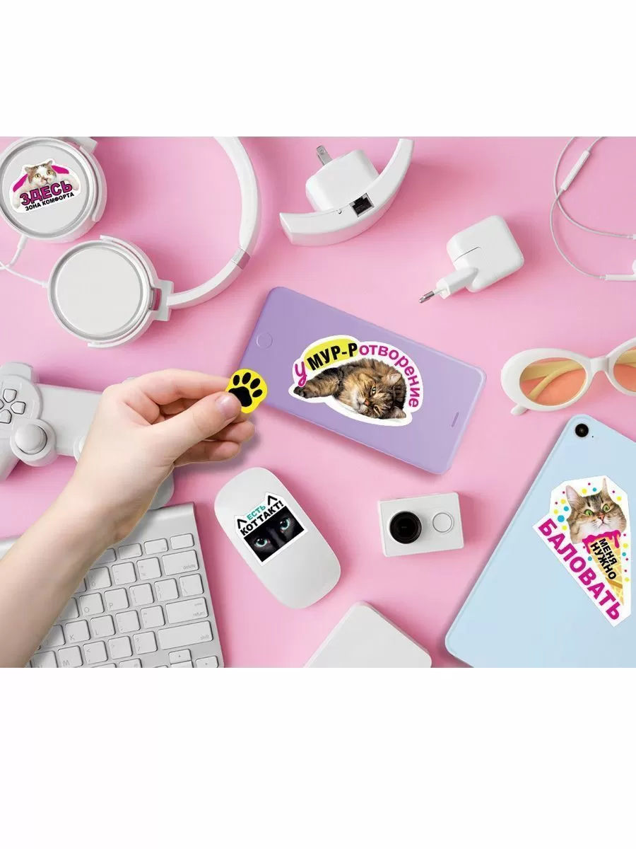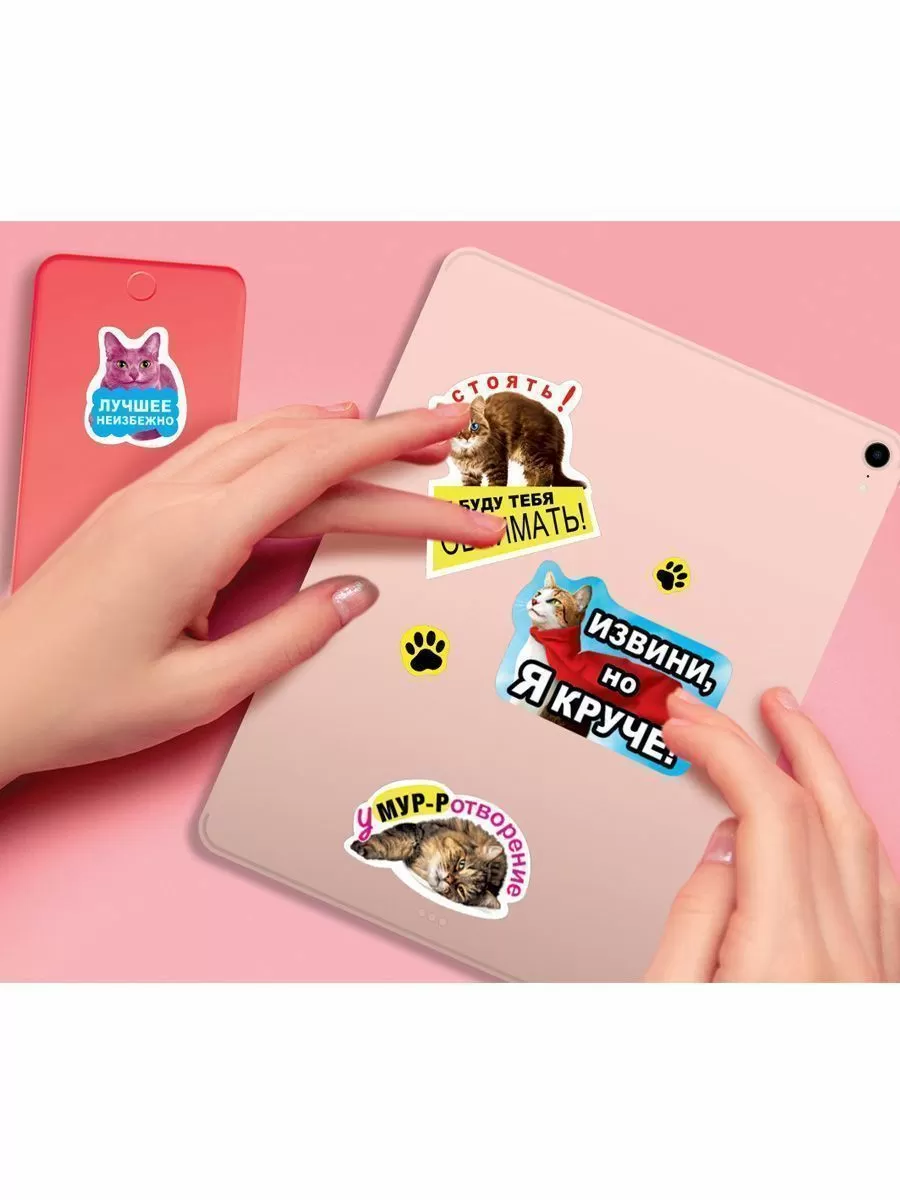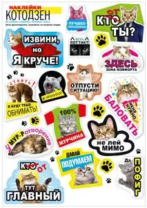 Белые и чёрные, рыжие и полосатые, мягкие и пушистые — коты и кошечки порадуют милыми мордашками! Набор ярких стикеров «Котодзен» несомненно придется по душе всем любителям пушистых питомцев. Смешные умилительные картинки и веселые фразы повысят настроение и вдохновят! С помощью наклеек можно декорировать тетради, ежедневники, кружки, гаджеты и многое другое. Отличный способ украсить смартфон, планшет или ноутбук. Стикеры помогут красиво оформить подарок. А еще это идеальный вариант для создания ярких тематических фотоальбомов!