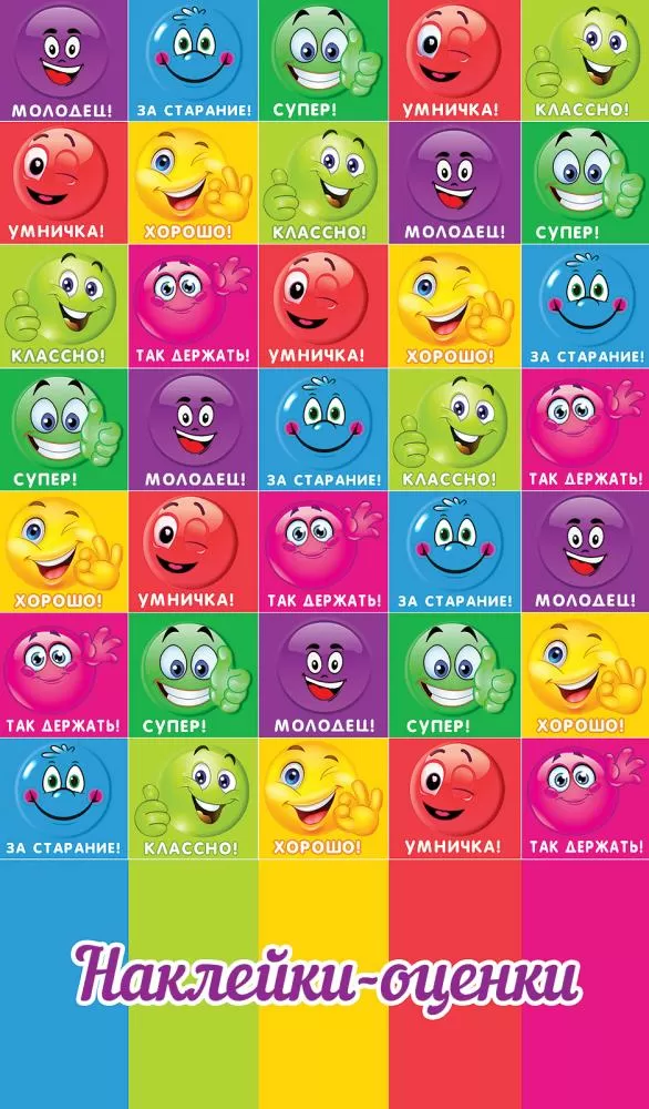 Наклейки-оценки с разнообразными иллюстрациями дополнены надписями: «Отлично!», «Хорошо!», «Умница!», «Молодец!» и др. В комплекте 20 листов с мини-наклейками. Размер каждого листа - 91х155 мм. Наклейки изготовлены из самоклеящейся бумаги. Материал состоит из следующих компонентов: плотная бумага-основа, с обратной стороны — адгезионный (клеевой) состав и нижний защитный бумажный слой. Сверху на бумагу-основу нанесено яркое полноцветное изображение. Наклейки хорошо держат форму. Клеевой состав обеспечивает надежное сцепление с поверхностью.