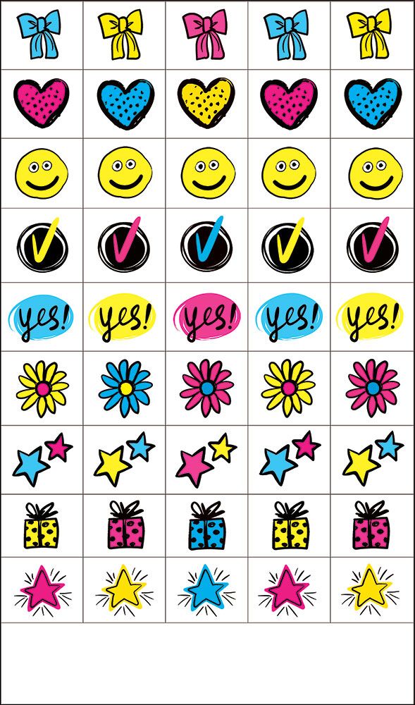 Наклейка-оценка формата А6 выполнена из самоклеящейся бумаги и представляет собой лист с фигурной вырубкой отдельных элементов. Размер готового изделия 155 × 91 мм обеспечивает совместимость с большинством стандартных папок, дневников и журналов, удобен для хранения в офисных и складских ячейках, а также для фасовки в торговые наборы. В упаковке 20. Поверхность без дополнительной отделки, что упрощает нанесение наклеек на бумагу, картон, пластиковые папки и другие гладкие основы, не создаёт бликов при освещении и позволяет при необходимости делать пометки поверх наклейки обычной ручкой или маркером. На листе размещены разноформатные цветные элементы: символические банты, сердца, смайлы, галочки, цветы, звёзды и подарки, выполненные в контрастной палитре жёлтых, розовых, голубых и чёрных тонов; изображения не содержат текстовых надписей, благодаря чему сохраняется универсальность применения в разных языковых средах и сценариях. Конфигурация фигурной вырубки обеспечивает чистое отделение каждого элемента от подложки без надрывов и заусенцев, что важно при интенсивном использовании в учебных заведениях, детских центрах, офисах и сервисных компаниях. Самоклеящаяся бумага рассчитана на краткосрочное и среднесрочное использование: она хорошо фиксируется на сухих поверхностях, не требует дополнительного клея и позволяет быстро формировать визуальную систему поощрений, отметок выполнения заданий, контроля посещаемости или мотивационных таблиц. Для розничного пользователя изделие подходит для ведения детских дневников достижений, оформления тетрадей, планеров, подарочной упаковки и тематических поделок. Компактный формат облегчает транспортировку и размещение на витрине, а единый дизайн набора позволяет включать наклейки в ассортимент сопутствующих товаров для школы, офиса и творчества без необходимости адаптации под конкретный предмет или мероприятие.