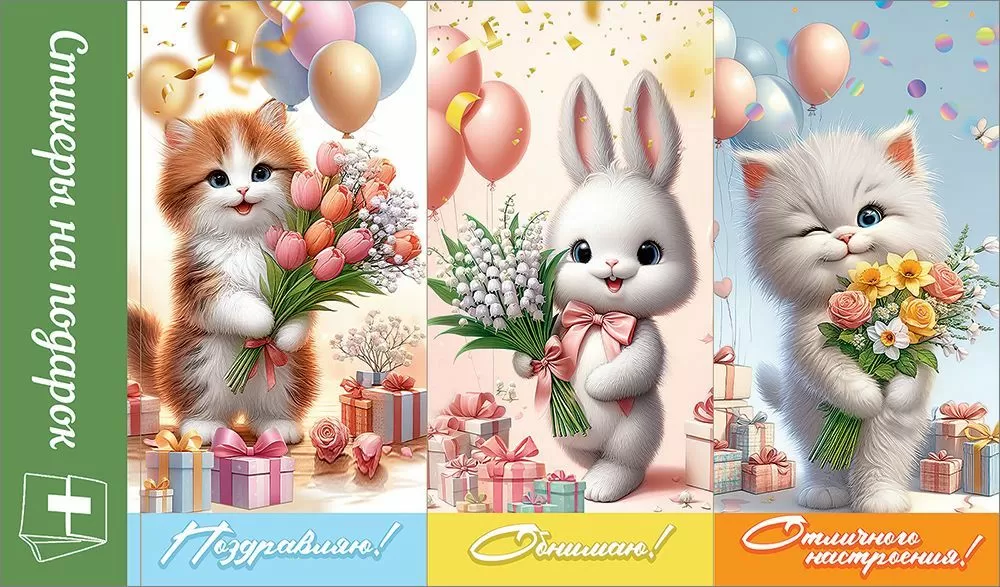 Стикеры на подарок с пожеланиями (пушистики с цветами)