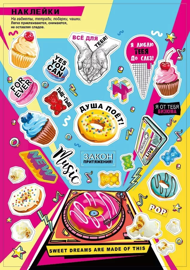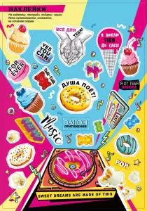 Вкусняшки forever! Ароматные пончики, аппетитные капкейки, разноцветные макаруны и другие сладости всегда радуют и поднимают настроение! Наклейки «Вкусняшки» будут очень мило смотреться на любых гаджетах, кружках, подарках и тетрадях. Легко приклеиваются, снимаются, не оставляя следов. Размер 161х233 мм.