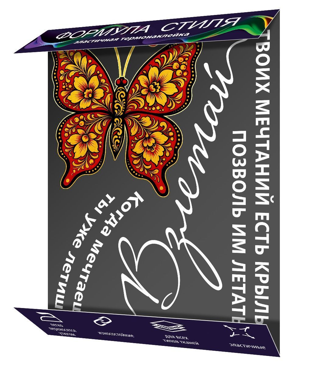 Термонаклейка формата Евро изготовлена из износостойкого ПВХ и предназначена для переноса на текстиль и другие термостойкие поверхности. Готовое изделие имеет размеры 208×148 мм, поставляется на подложке, что облегчает точное позиционирование при массовом нанесении и снижает риск брака при термопереносе. Плотный ПВХ-слой обеспечивает стабильную геометрию рисунка и равномерное прилегание к основе, что важно при серийном оформлении изделий в швейных и сувенирных производствах, мастерских по персонализации одежды и аксессуаров, а также при мелкооптовых закупках для розничных точек. На наклейке размещено цветное изображение декоративной бабочки с орнаментом в теплой гамме, дополненное композиционно выстроенными надписями; фон подложки темный, что позволяет визуально оценить контраст и предполагаемый эффект на изделиях схожих оттенков. Материал рассчитан на кратковременное воздействие повышенной температуры при термопрессовании или проглаживании утюгом через защитный слой, после переноса рисунок образует эластичную пленку, устойчивую к сгибам и типичным бытовым нагрузкам. Для оптового сегмента изделие удобно тем, что поставляется в единичных листах с повторяемыми размерами и стабильным качеством печати, легко упаковывается в стандартные конверты и короба, не требует специальных условий хранения, кроме защиты от перегрева и прямых солнечных лучей. В розничном использовании термонаклейка подходит для декорирования футболок, свитшотов, спортивной и детской одежды, сумок, рюкзаков, текстильных обложек и интерьерного текстиля, позволяя быстро обновить внешний вид изделия или создать тематическое оформление. Отсутствие дополнительной отделки упрощает прогнозирование поведения материала при стирке и глажке, а также делает совместимым нанесение с большинством гладких тканей на основе хлопка, смесовых и синтетических материалов при соблюдении рекомендованного температурного режима. Количество в упаковке: 1.
