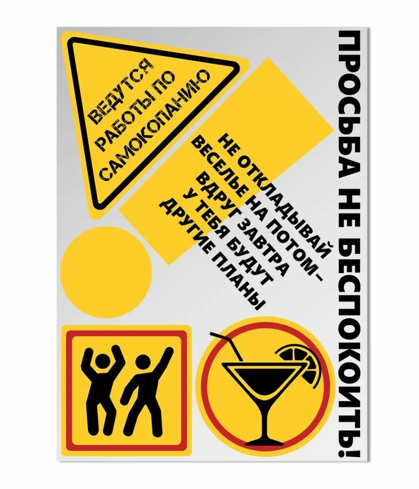 Открытка-сертификат «Просьба не беспокоить» формата евро выполнена из плотного картона, рассчитанного на интенсивную эксплуатацию в условиях праздничных мероприятий и длительное хранение в качестве памятного сувенира. Лицевая сторона оформлена графикой в стиле предупредительных табличек: контрастные жёлтые и чёрные элементы, лаконичные пиктограммы танцующих фигур и коктейля, текст «Ведутся работы по самокопанию» и «Не откладывай веселье на потом – вдруг завтра у тебя будут другие планы», а также вертикальная надпись «Просьба не беспокоить!». Такое решение делает изделие уместным как самостоятельный подарок-сюрприз, так и как вложение к денежному презенту, сберегательной книжке или сертификату для молодожёнов, жениха и невесты, коллег, друзей. Внутренний блок оставляет место для авторского поздравления, напутствия в счастливую семейную жизнь, персональных пожеланий или вклейки фотографии формата А4, превращая открытку в памятный подарочный аксессуар. Для оптового покупателя открытка удобна в складской и транспортной логистике: формат евро оптимален для стандартных витрин и почтовых отправлений, минимизирует повреждения углов, изделия легко штабелируются и фасуются по 10 штук. Картонная основа устойчивa к изгибам, не деформируется при кратковременном воздействии влаги, сохраняет геометрию при длительном хранении. Отделка блёстками в лаке с радужным эффектом подчёркивает элементы дизайна, не осыпается, не пачкает сопутствующую продукцию, что важно при комбинированной выкладке с другими свадебными и поздравительными позициями. Открытка подходит для оформления денежных подарков, сертификатов и небольших вложений, используется как универсальный свадебный, помолвочный или юбилейный сувенир для молодожёнов, дочери, коллеги, подруги, жениха, невесты от родителей и друзей, дополняет ассортимент дизайнерских, необычных, стильных и оригинальных бумажных изделий для торжеств.
